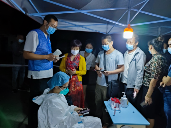 当天的核酸检测工作持续到了24:00,几名青年志愿者一直坚持到当天核酸检测工作结束。在此期间,由于检测进展缓慢,夜间天气不好,排队居民情绪一度躁动。志愿者们通过各种方式耐心安抚大家,劝导部分年纪大或者带有小孩的居民回家休息,第二天再做检测;对不愿意放弃离开的,积极为他们提供座椅,得到了排队居民的理解,最终在24:00左右,他们才结束了这长达8小时的鏖战。