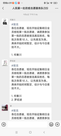 “各位志愿者,现在开始征集明日全员核检第一批志愿者,请愿意参加第一批的志愿者接龙真实姓名,每批次各需10人,以先接龙为准。具体开始时间暂定,估计与今日差别不大。”