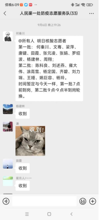 每天这个时间段,何秦川在“志愿服务队”群里发出号召,通常10多分钟,20名志愿服务队就名额满员。何秦川每次排在第一位。晚上10点前将组织好第二天志愿服务队伍名单报送给社区,安排前后轮班人员,保障第二天全员核酸检测工作顺利进行。