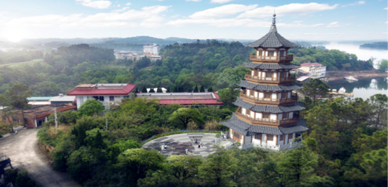 “鲁班阁”位于三台县鲁班水库主坝右坝肩山顶,占地面积2000平方米,阁楼外部形态为七檐五层,建筑高度23.5米,建筑面积281.84平方米。阁楼主体及外部装饰为一期工程,总投资约397万元。“鲁班阁”的建设不仅是人民渠水文化展示的重要窗口,更是都江堰水利人工匠精神传承的重要载体。项目本着传承历史、展望未来、自然和谐为目标,定位于集水库监测管理、水旅融合、水文化展示等多种功能为一体的景观性纪念仿古建筑,建成后与主坝左坝肩山顶石质汉白玉纪念碑遥相呼应,追求把自然美和建筑美融为一体的意境。