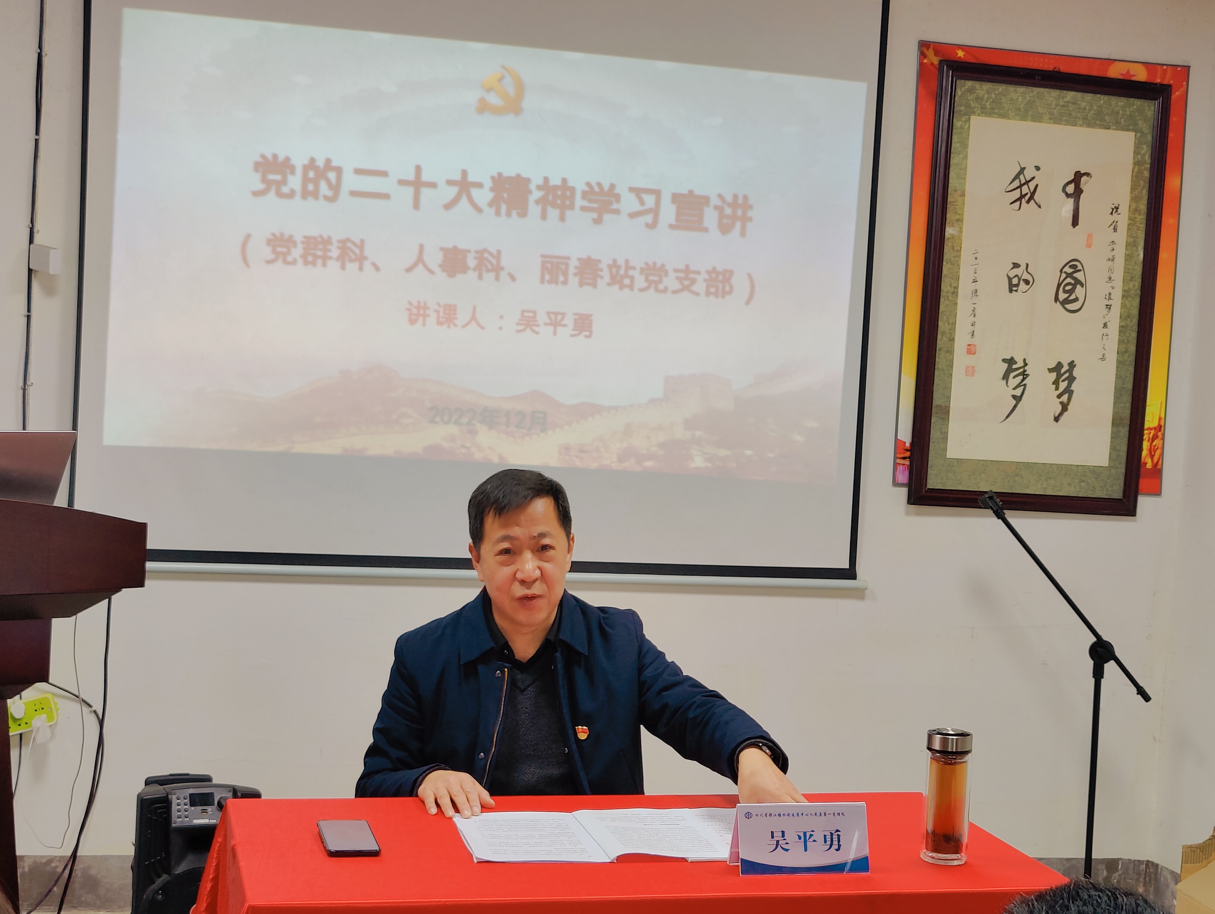 为深入学习贯彻党的二十大精神,充分发挥党员领导干部的示范带头作用,进一步把全体党员干部的思想行动统一到党的二十大精神上来,凝心聚力建设“国际知名、国内一流”灌区榜样,12月9日,党委副书记吴平勇深入基层为丽春站、党群科、人事科等党支部全体党员讲二十大精神专题党课。