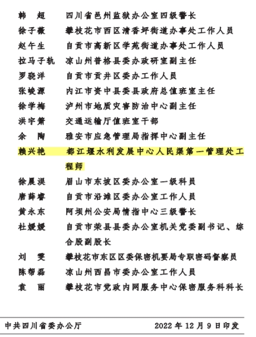12月9日,中共四川省委办公厅印发的《中共四川省委办公厅关于表扬 “忠诚值守庆盛会—我们的值班故事”主题征文活动获奖单位和个人的通报》(厅文〔2022〕77号)中,人民渠第一管理处供水管理科赖兴艳同志参赛作品《共此青绿》经过激烈角逐,榜上有名。