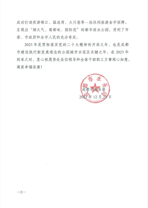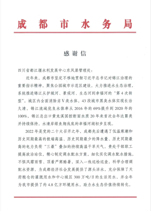 感谢信指出,2022年,成都先后遭遇了低温寒潮和历史同期最高的极端高温、历史同期最少的降水量、历史同期最高的电力负荷“三最〞叠加的持续高温干旱天气,东风渠管理处干部职工提高政治站位,精心制定调水配水方案,细化实化调水配水措施,不惧风霜雨雪,顶着严寒酷暑,深入一线巡检巡查,科学合理调配水资源,为成都经济社会发展提供了源头活水,充分保障了天府粮仓的灌溉用水和中心城区 300万吨/日的生活用水。全年为成都市提供环境用水约4.8亿m³,助力成都市成功打造夜游锦江、猛追湾、大川巷等一批休闲旅游金字招牌,呈现出“烟火气、蜀都味、国际范”的都市滨水公园,受到了市委、市政府和全市人民的充分肯定。