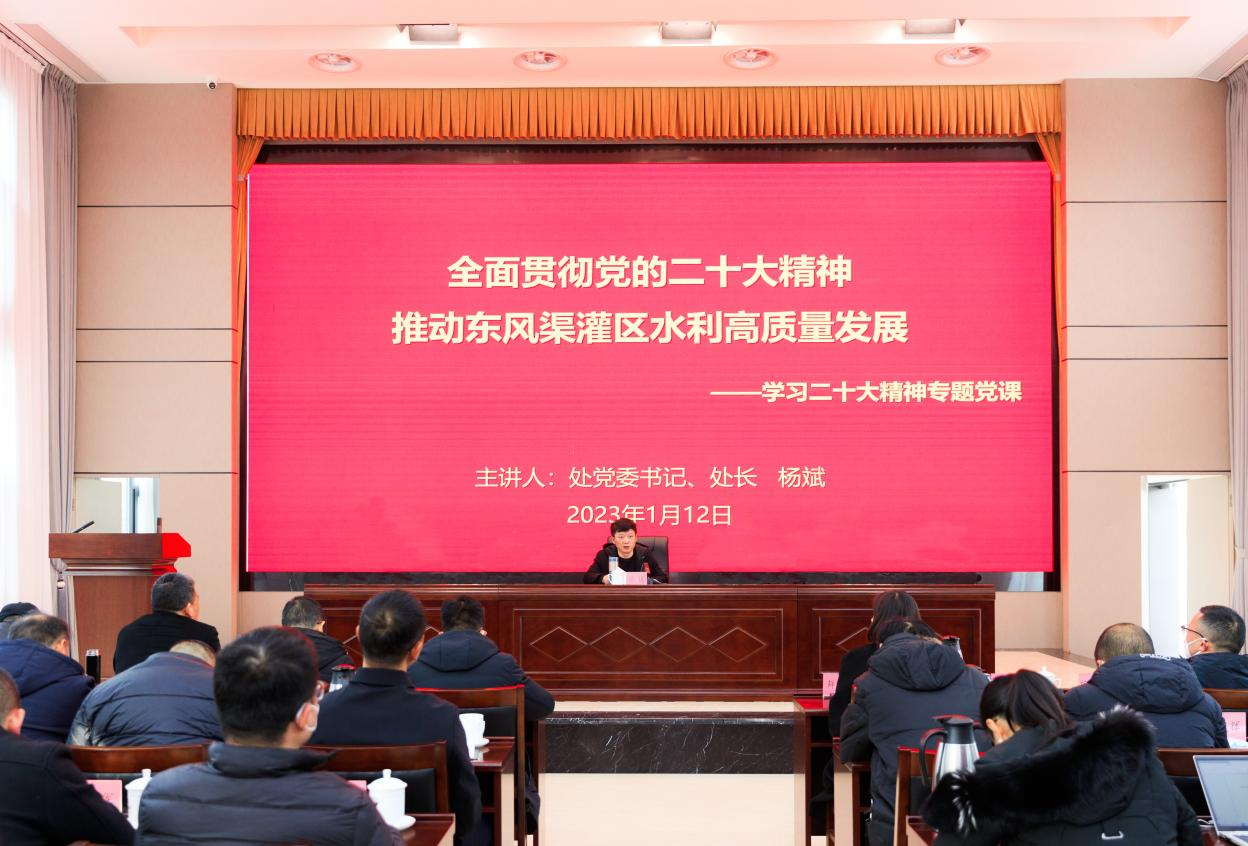 为全面深入学习宣传贯彻党的二十大精神,在全面学习、全面把握、全面落实上狠下功夫,确保党的二十大精神在东风渠落地生根、开花结果,2023年1月12日,东风渠管理处党委书记、处长杨斌以《全面贯彻党的二十大精神 推动东风渠灌区水利高质量发展》为题,为处党委委员、全体中层干部讲授了一堂生动的专题党课。