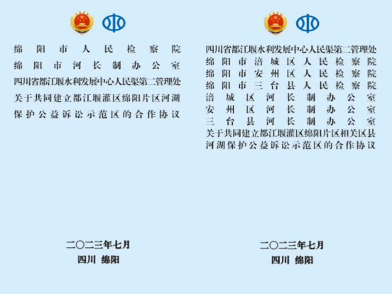 为推动新时代检察公益诉讼和都江堰灌区高质量发展,近日,人民渠第二管理处联合绵阳市涪城区、安州区、三台县人民检察院及河长制办公室同步签署《关于共同建立都江堰灌区绵阳片区河湖保护公益诉讼示范区的合作协议》和《关于共同建立都江堰灌区绵阳片区相关区县河湖保护公益诉讼示范区的合作协议》,探索建立联席会议、线索发现及移送、信息共享、案件咨询和提前介入、预防性公益诉讼工作、建立联合巡河、建立联合宣传培训等七大机制,推动都江堰灌区绵阳片区相关区县河湖保护公益诉讼示范区协作机制全面建立。