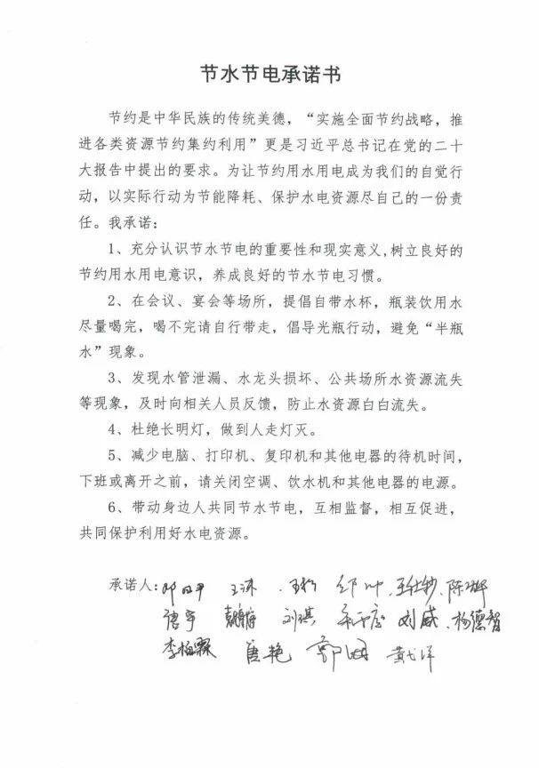 会上,青年理论学习小组成员结合自身工作岗位,分享了学习《深入学习贯彻习近平关于治水的重要论述》的心得体会以及生活中的节水节电小妙招。大家一致表示,要从自身做起,不断提升风险防范能力。现场,大家还进行了节水节电宣誓,并签订了《节水节电承诺书》。