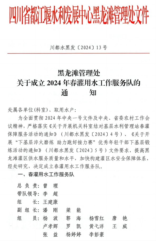 2024年3月5日,在全国第61个“学雷锋纪念日”和第25个“中国青年志愿者服务日”到来之际,黑龙滩水库开闸放水春灌工作正式开启之时,四川省都江堰水利发展中心黑龙滩管理处正式组建以党委书记、处长曾理为总负责人,10余名年轻干部为骨干成员的春灌用水工作服务队。