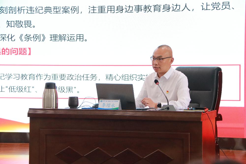 推进全面从严治党向纵深发展是实现党的自我革命和保持纯洁性的有效途径,是应对新的复杂环境和严峻挑战的必然选择,是推动党的事业发展和强化责任担当的有力保障。李增永要求,一是把握精髓要义,逐章逐条“学纪”。要深入学习贯彻习近平总书记关于党的自我革命的重要思想,以永远在路上的坚韧和执着,尽到关键责任、发挥关键作用、当好关键引领,教育党员干部搞清楚党的纪律规矩是什么,弄明白能干什么,不能干什么,切实做到知敬畏、存戒惧、守底线;二是注重融会贯通,入脑入心“知纪”。要始终坚持在党纪学习过程中把自己摆进去、把工作摆进去、把职责摆进去,让党纪学习教育每项措施都成为促进推进灌区重点工程建设、创新“都江堰灌区电站集中控制中心”管理模式、培育壮大新质生产力人才队伍等工作高质量发展的有效举措;三是坚持修身自省,对标对表“明纪”。要进一步深化对忽视党纪、违反党纪问题危害性的认识,坚持严字当头、全面从严,充分发挥纪律建设标本兼治的利器作用,不断增强自我净化、自我完善、自我革新、自我提高能力,切实增强政治定力、纪律定力、道德定力、抵腐定力,始终做到忠诚干净担当;四是强化知行合一,慎始慎终“守纪”。要时刻保持清醒头脑,做到心中有纪、行动守纪,以严明的纪律确保坚定拥护“两个确立”、坚决做到“两个维护”。要准确掌握“六大纪律”,明确党员干部日常言行的衡量标尺,自觉把党纪当成“紧箍咒”“护身符”,用纪律约束自己的一言一行,知行知止、令行禁止,确保全面从严治党任务的有效实施。
