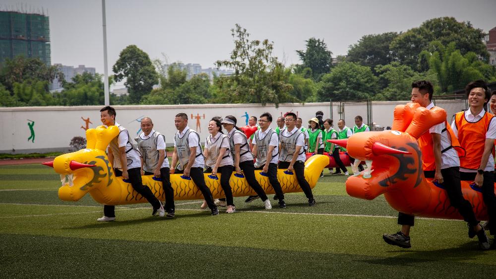 8支代表队参赛队员身穿白色短衬衣,精神饱满。选手们凭借丰富的知识储备、默契的团队配合,比脑力、拼速度,展现出比学赶超、昂扬向上的精神风貌。 趣味运动会以团结协作为主题,设一圈到底、摸石过河、合力筑塔、众星捧月、旱地龙舟比赛等5个运动项目,现场随机组建了6支队伍,运动员们身穿各色战袍,满怀激情,各队齐心协力、共同作战,展开了一场场激动人心的比拼。
