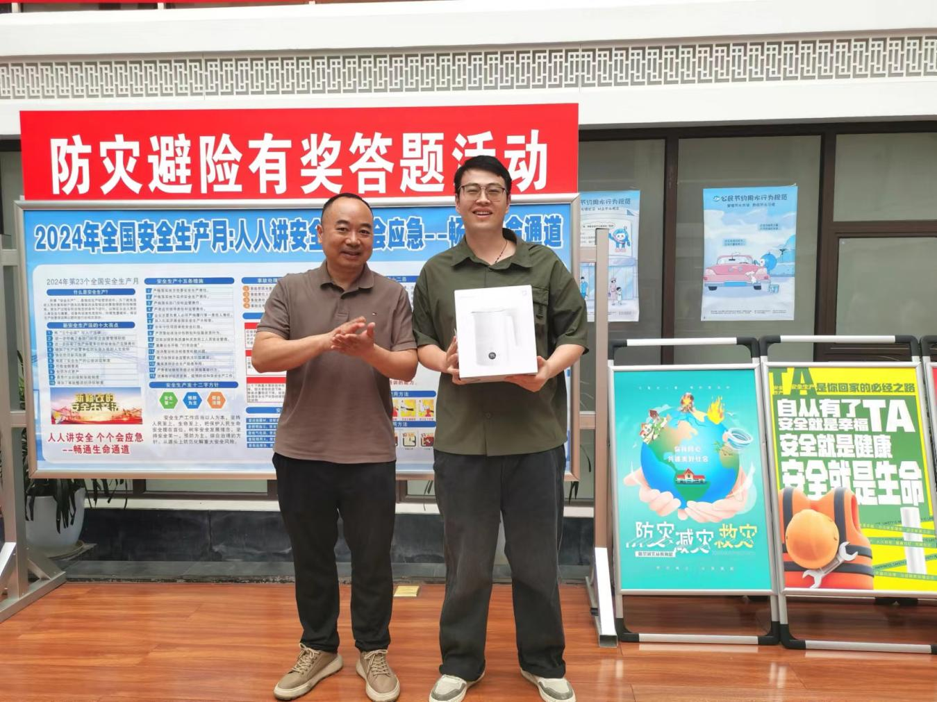 “请抽到1号题的回答:雨天在户外活动时,如果发现电线断落在水中,并且距离自己较近时不要惊慌,应怎样离开?”“答:单腿跳跃。”“回答正确,请工作人员发放奖品。”