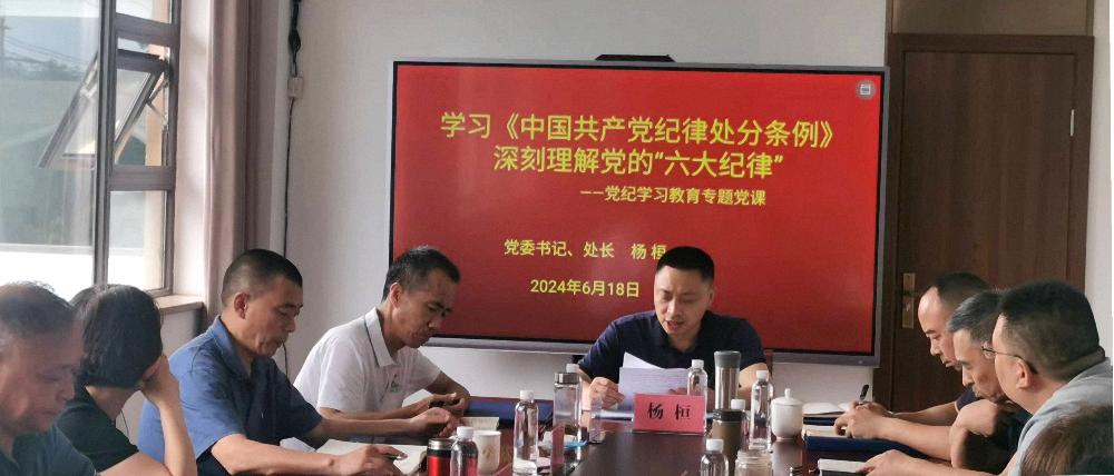 6月18日,都江堰渠首管理处开展党纪学习教育专题党课,党委书记、处长杨桓以《学习〈中国共产党纪律处分条例〉 深刻理解党的“六大纪律”》为题作党课报告。处班子成员、组长以上党员干部和青年团员代表参加。