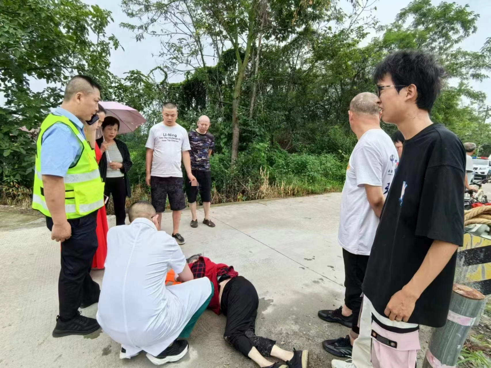 两名队员先是和热心群众在下游邓通桥上拉起救生绳、救生圈进行施救,但由于落水者年龄较大,且已经出现脸色苍白、身体下沉情况,无法自行借助救生绳脱离危险,继续向下游漂去。最终,两名队员通过不懈努力,竭尽全力与热心群众密切配合,在143号分水洞梯步处将落水者救起,使其及时得到赶来的120急救人员的救治。