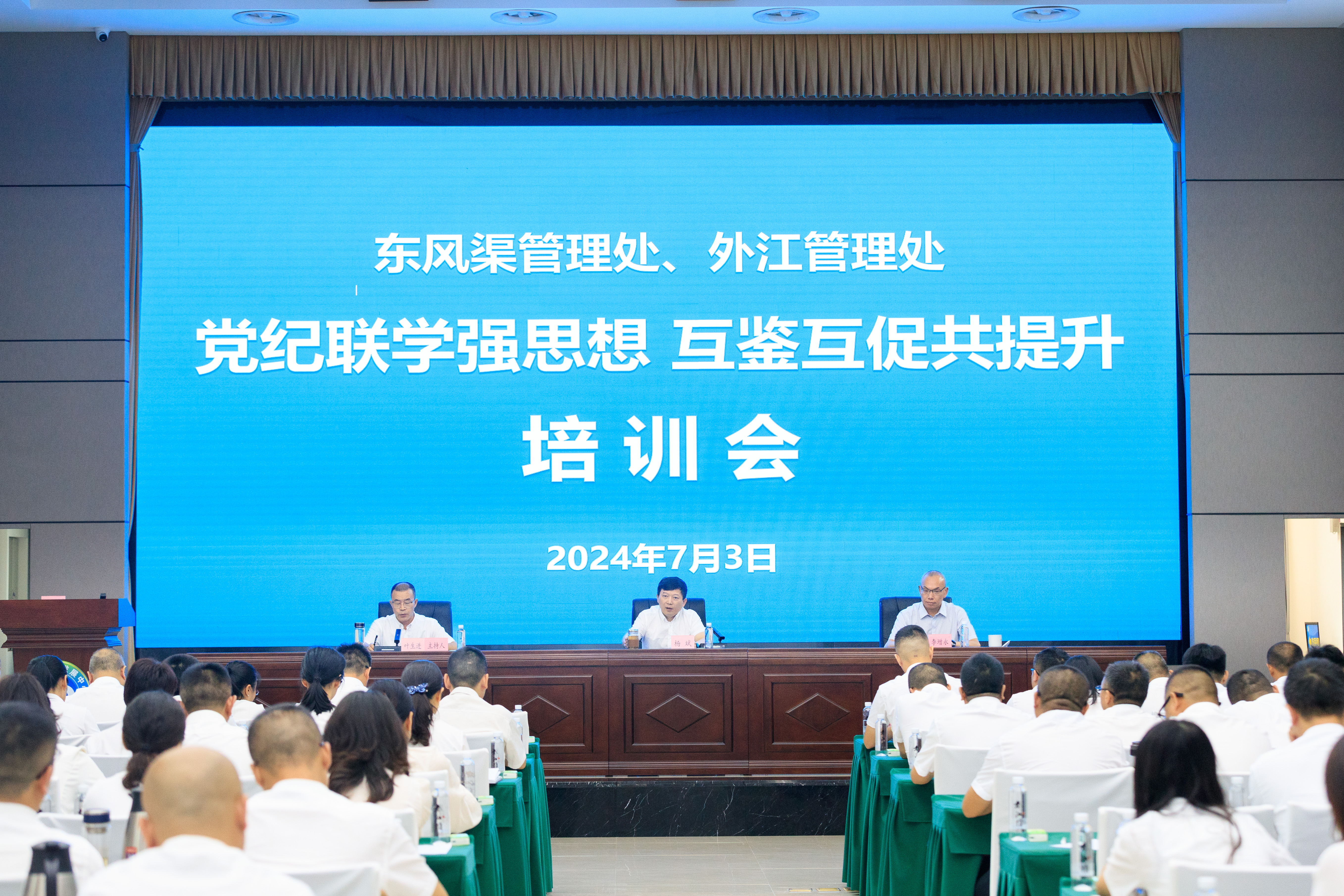 2024年7月3日,东风渠管理处与外江管理处联合开展“党纪联学强思想,互鉴互促共提升” 党纪学习教育培训班。东风渠管理处党委书记、处长杨斌致辞,外江管理处党委书记、处长李增永讲话。东风渠管理处党委委员、副处长叶生进主持开班仪式。