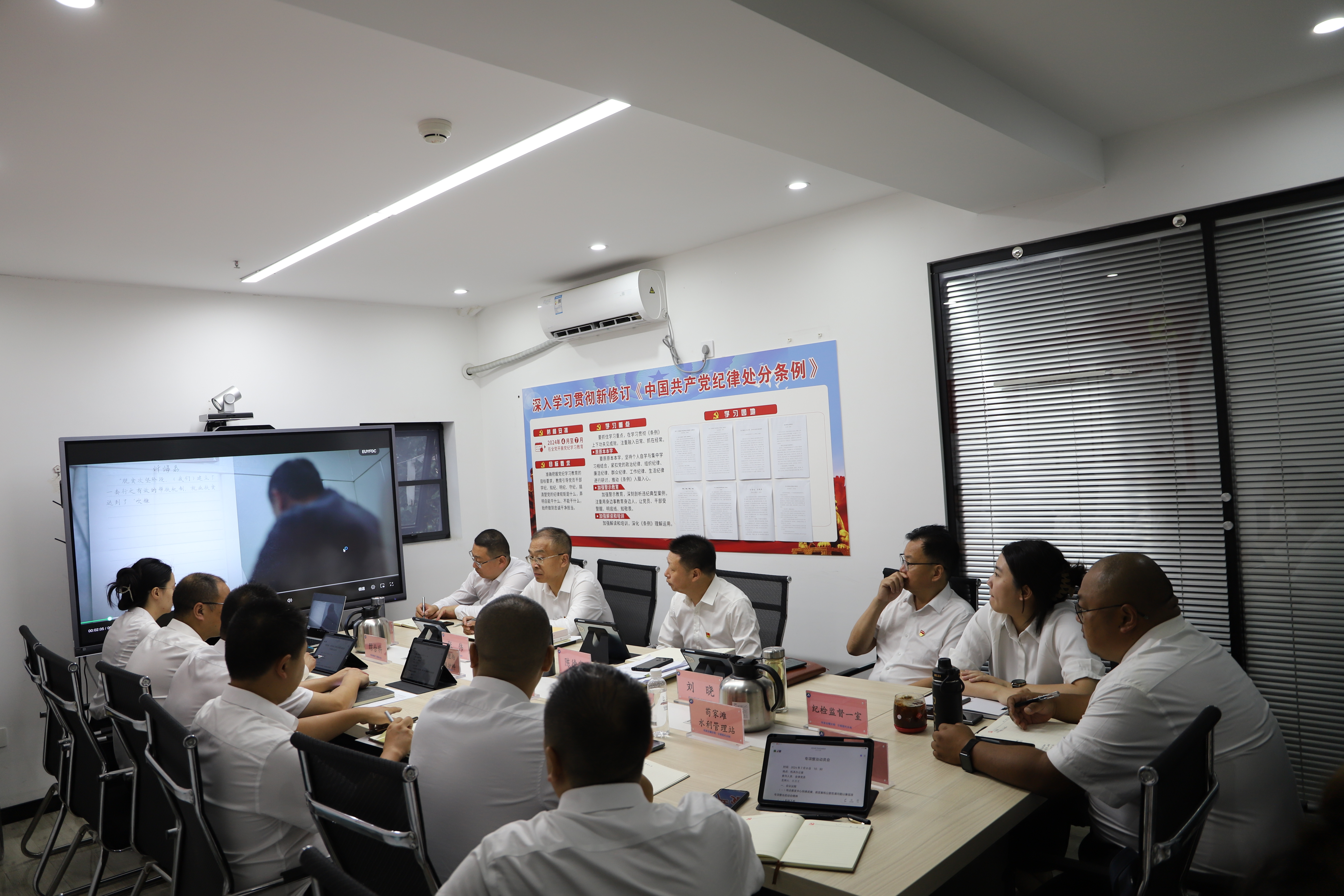 7月8日上午,毗河管理处召开警示教育动员会,参会干部职工现场观看了警示教育片,学习了《习近平总书记关于全面加强党的纪律建设的重要论述》和《论党的自我革命》。支部书记、处长陈德宽主持会议。