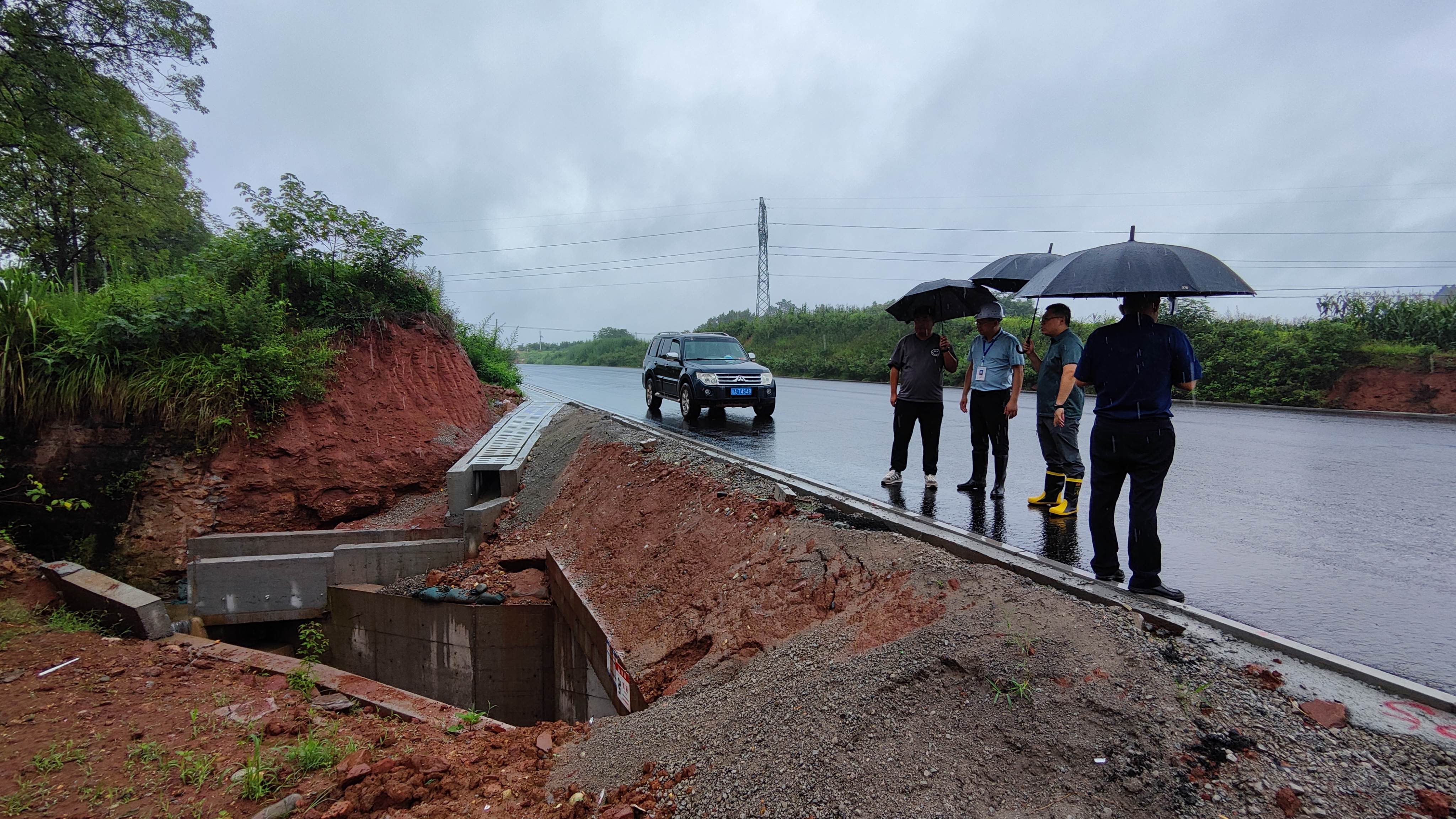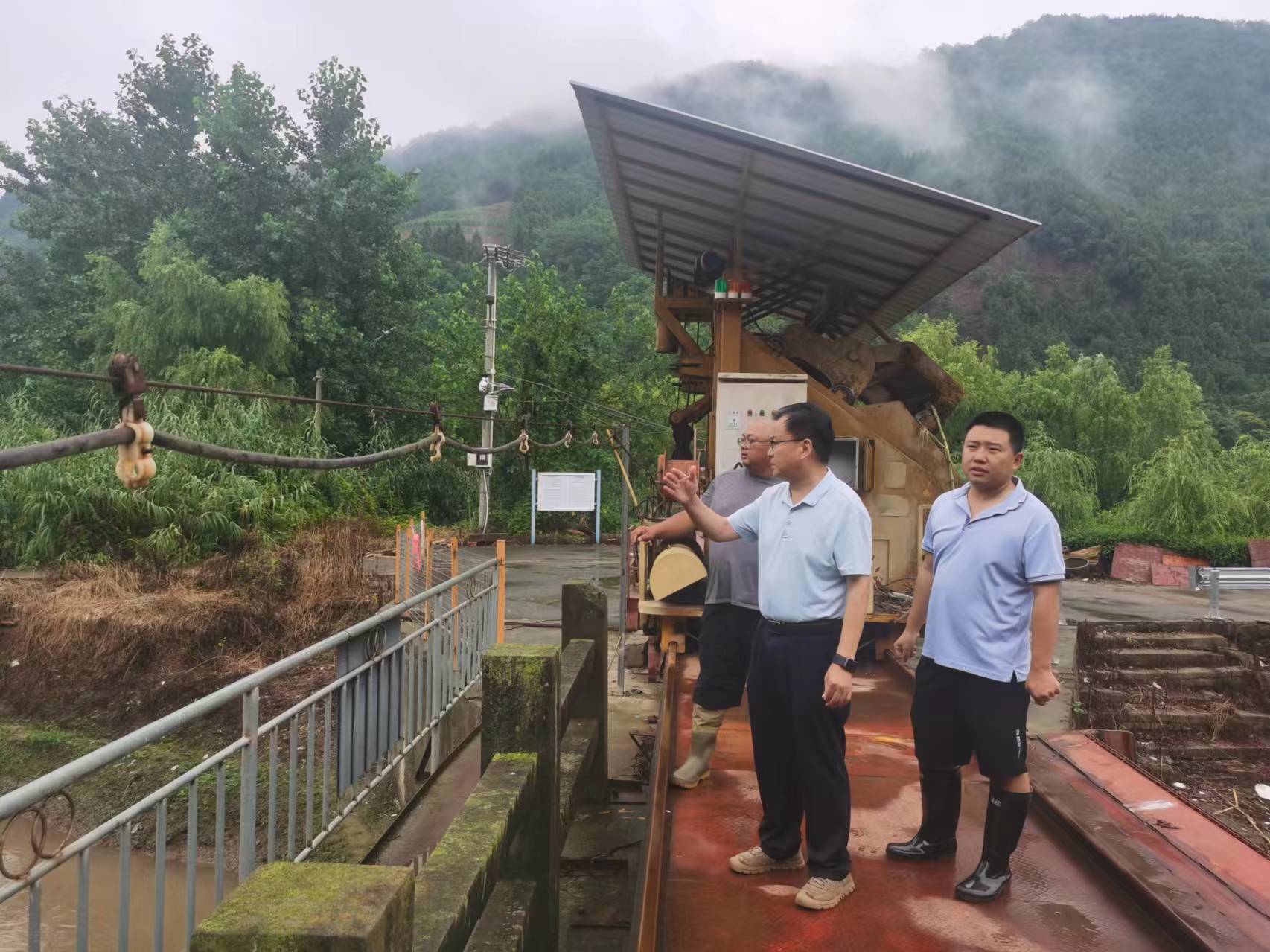 (雨中对张家岩水库主坝背坡面进行安全排查)