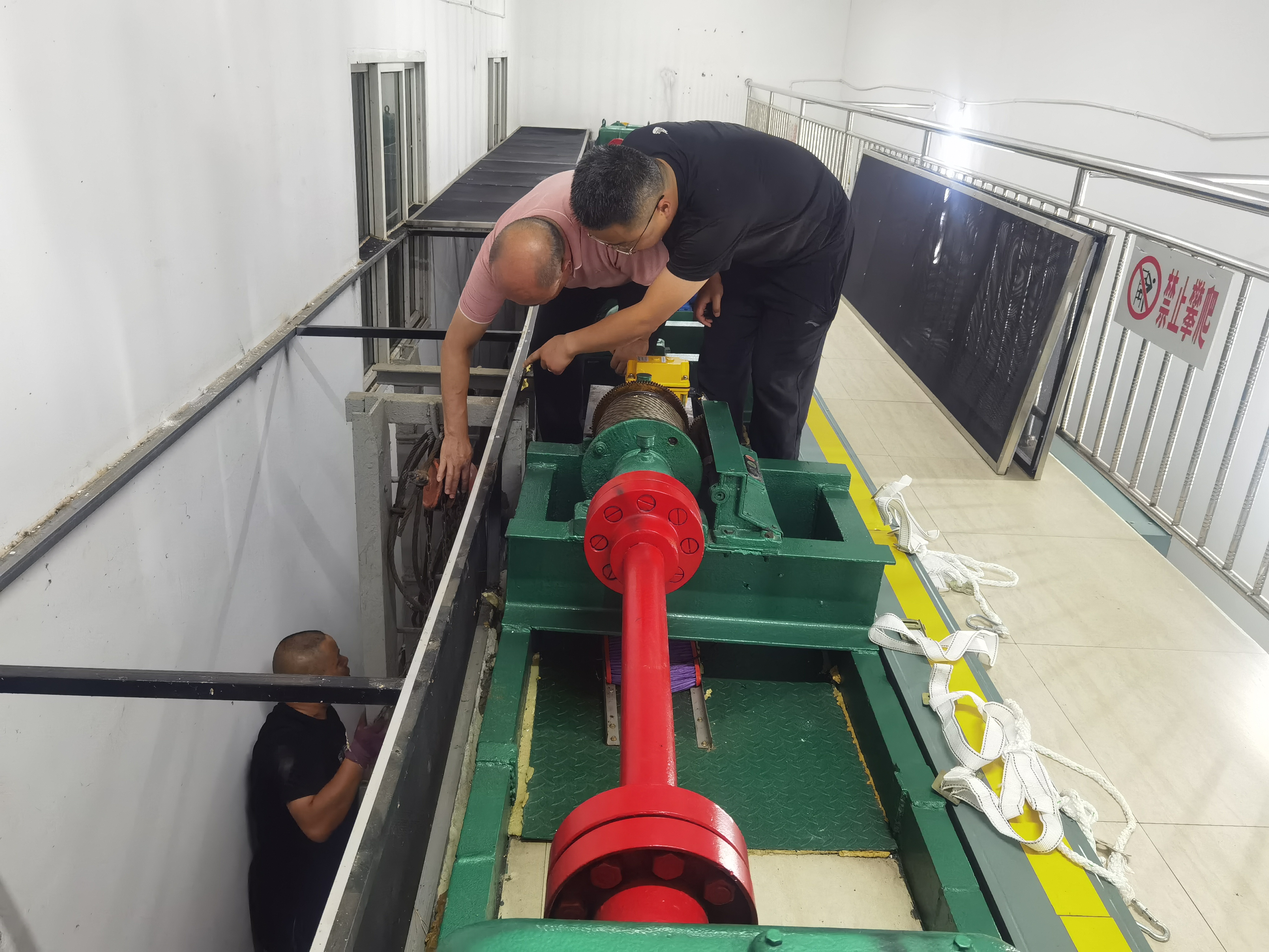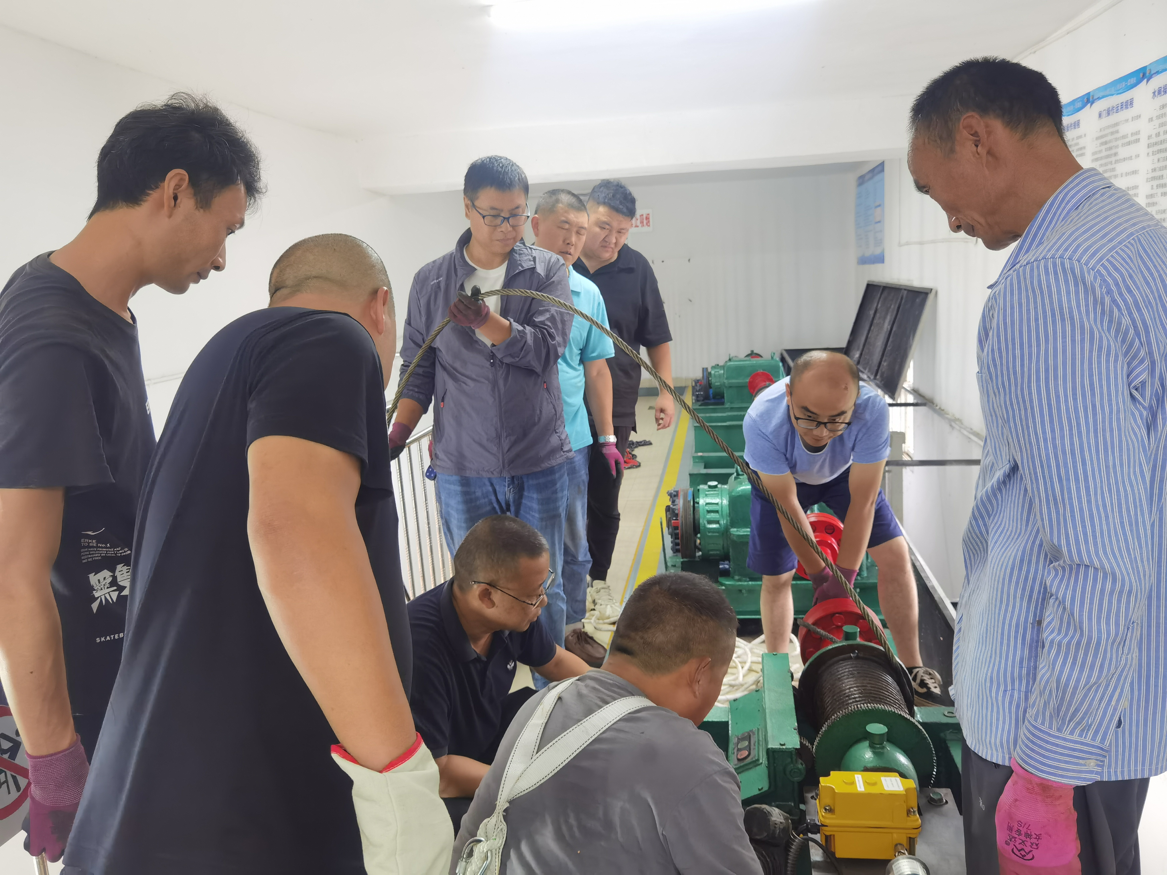 为了及时解决这一问题,大家一致采用手拉葫芦先将卡阻闸门临时吊起并进行固定,随后再对卡阻的钢绳进行切割后更换新钢绳。随即各人员按分工投入抢险工作。
