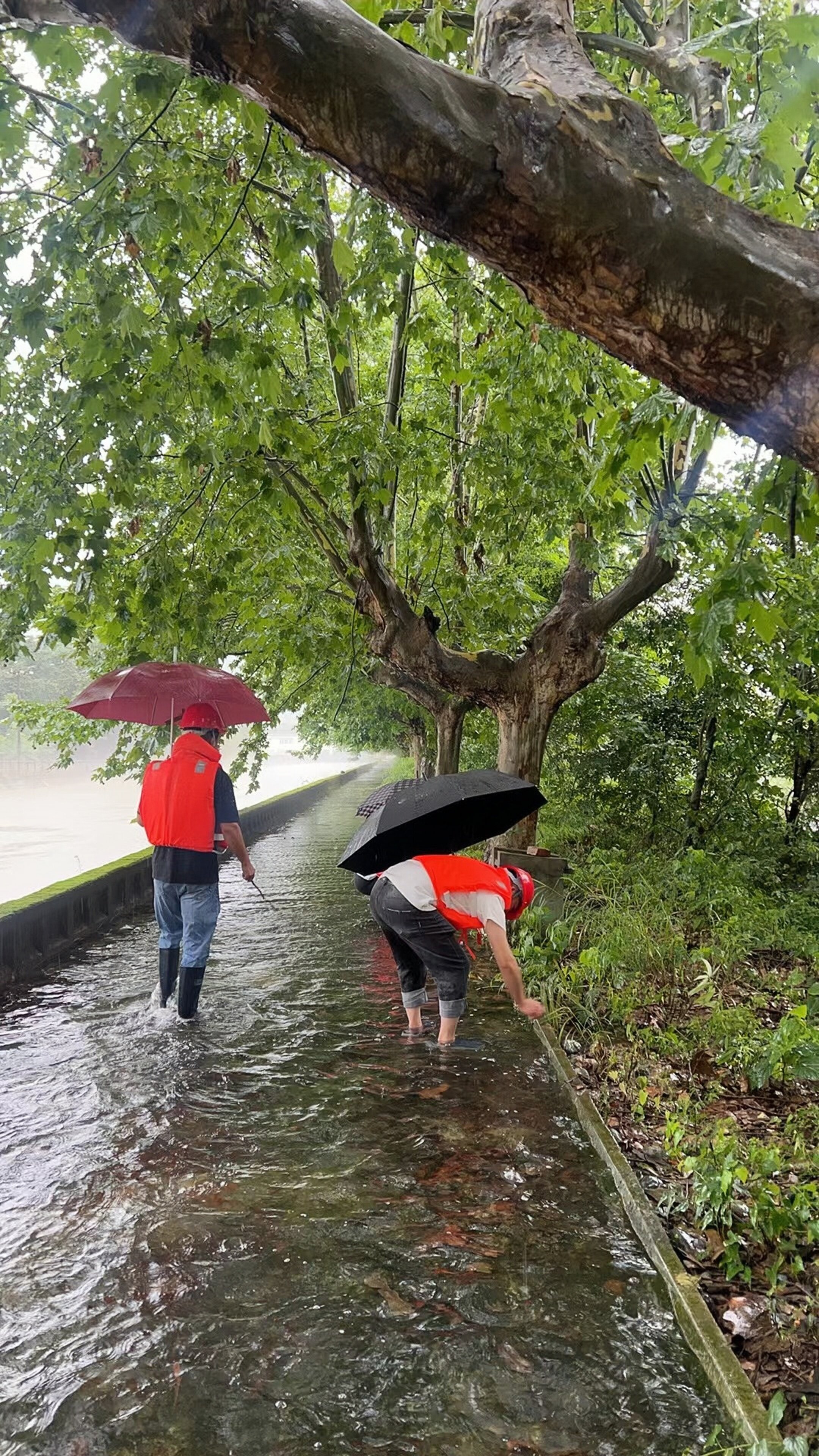 天亮了,雨势渐小,刘大伟顾不得休息又叫上同事出门了。他们沿着河道开展巡查,发现厂区附近河堤有16处排水孔存在堵塞,“这段河堤排水孔堵塞了,雨水积这么深,会影响紧急情况时的救援,而且会对救援人员、巡查人员、行人造成安全隐患,要马上清理。”刘大伟和同事立即对隐患问题逐一进行了清理、疏通,积水通过排水孔流走,河堤路面终于缓缓露出。