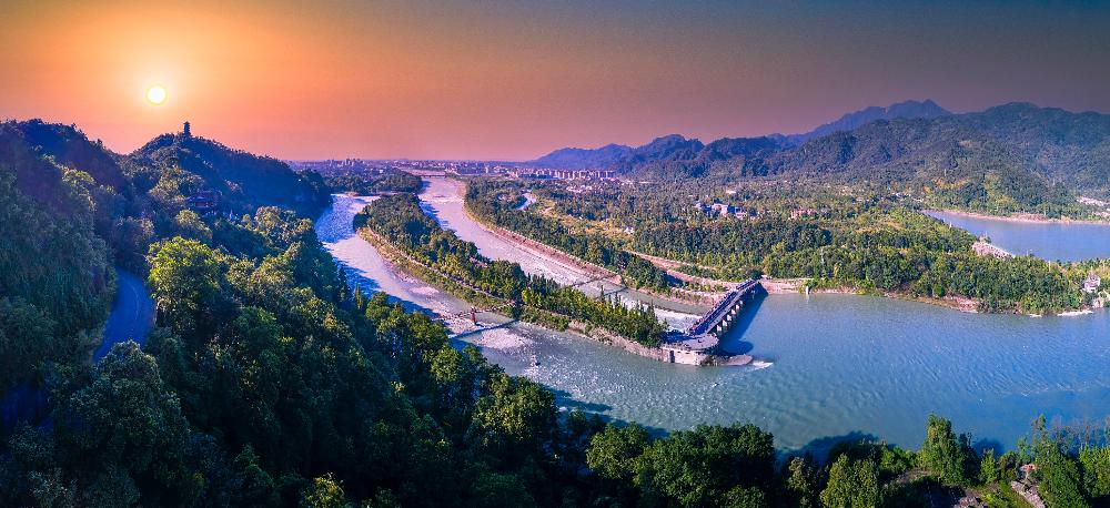俯瞰都江堰水利工程,东风渠灌区起于都江堰