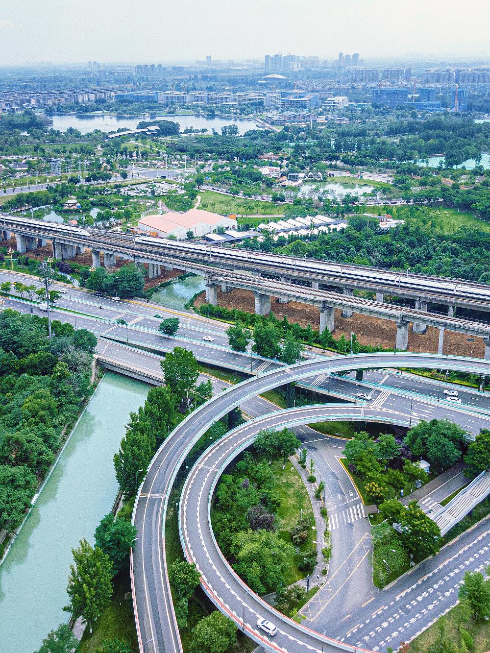 “东风银渠”、葱茏草木、飞驰的“和谐号”描绘出公园城市专属的“薄荷曼波”