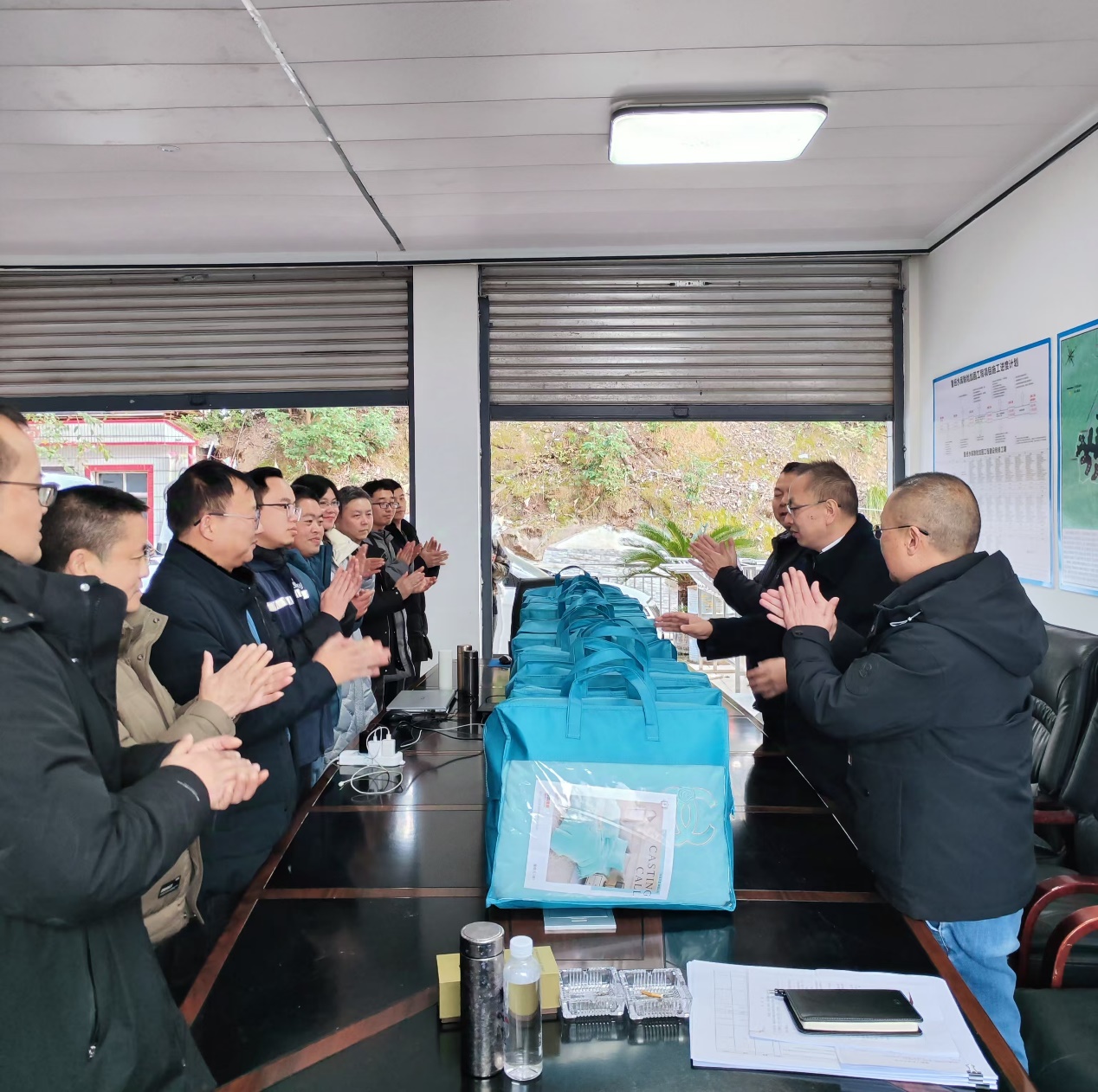 12月16日,严寒冬日,鲁班水库除险加固工程施工现场暖意洋洋,人民渠第二管理处党政班子为现场办全体人员送去关心和温暖。