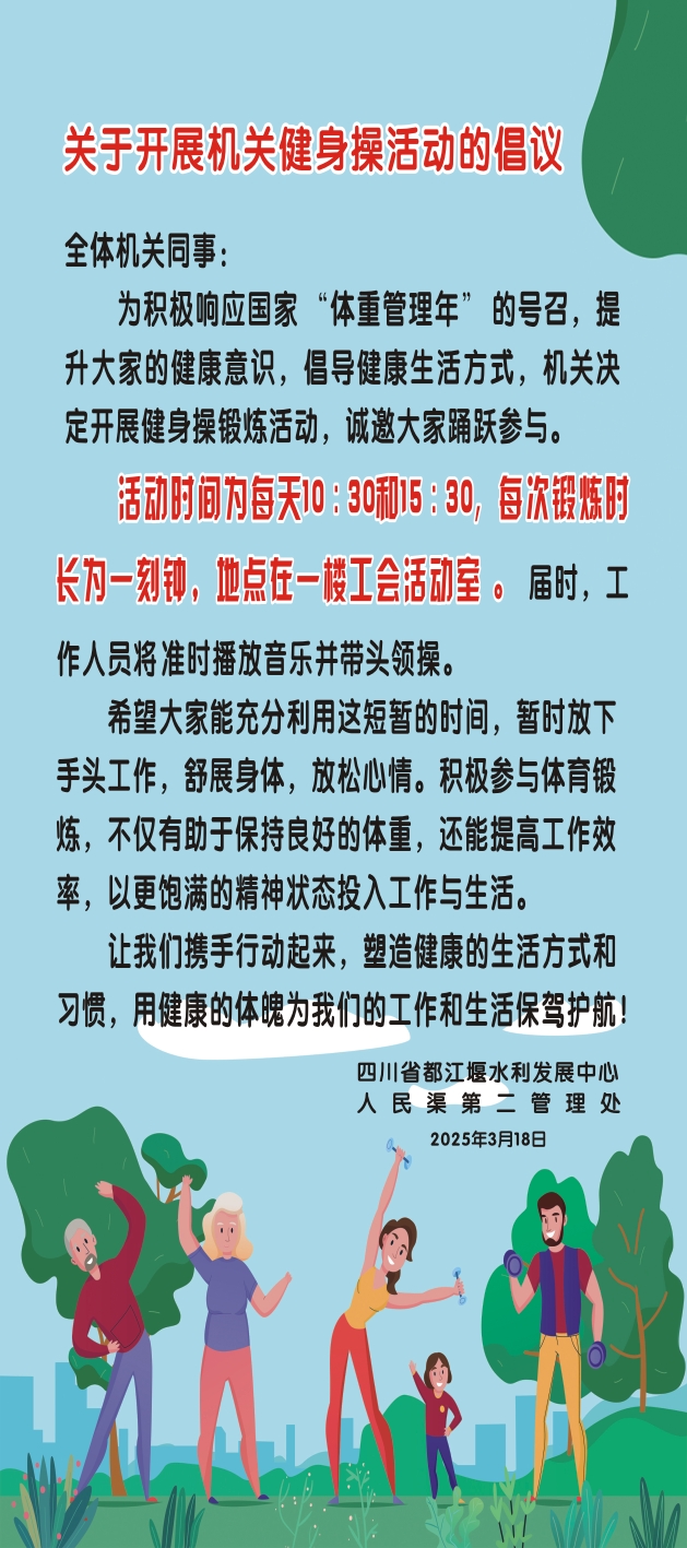 为深入践行“健康中国”理念,积极响应国家“体重管理年”号召,切实增强职工队伍凝聚力,营造“快乐工作、健康生活”的团队氛围。近日,人民渠第二管理处组织处机关干部职工开展健身操锻炼活动,全面展现新时代水利人团结奋进、锐意进取的精神风貌。