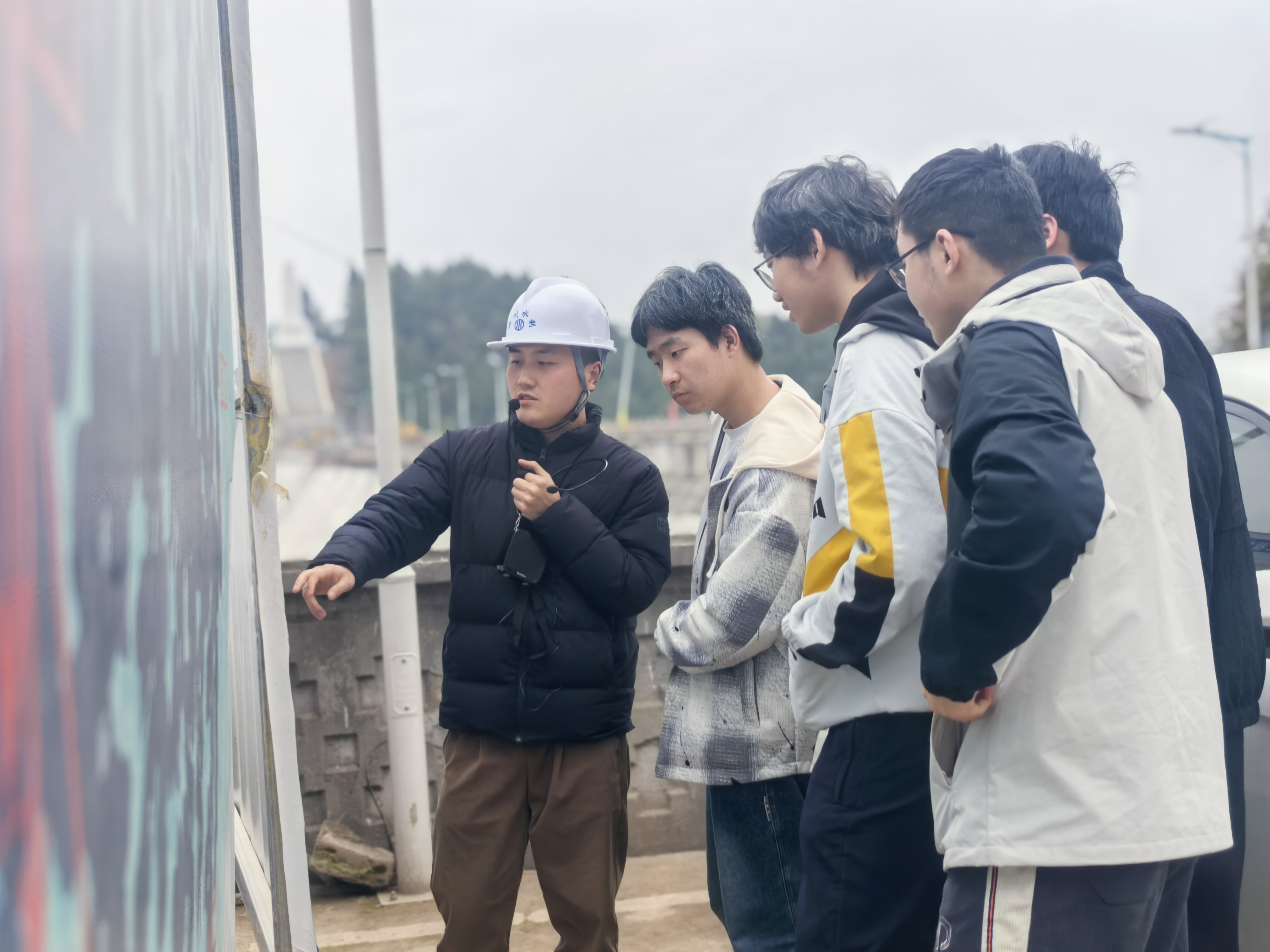 在鲁班水利管理站,工作人员热情接待师生一行,并向同学们详细介绍鲁班水库的相关情况。始建于上世纪70年代的鲁班水库拥有2.94亿立方米的库容,其水面面积广阔,是一座以灌溉为主,兼有供水、发电等综合利用功能的大型水利工程,在水资源存储和调节方面发挥着重要作用。其不仅在当地的水利体系中发挥着中流砥柱的作用,更是一座承载着先辈们智慧与汗水的历史丰碑。在建设工地旁,工作人员着重介绍了此次鲁班水库除险加固工程工作,同学们认真聆听并积极提问,现场学习氛围浓厚。