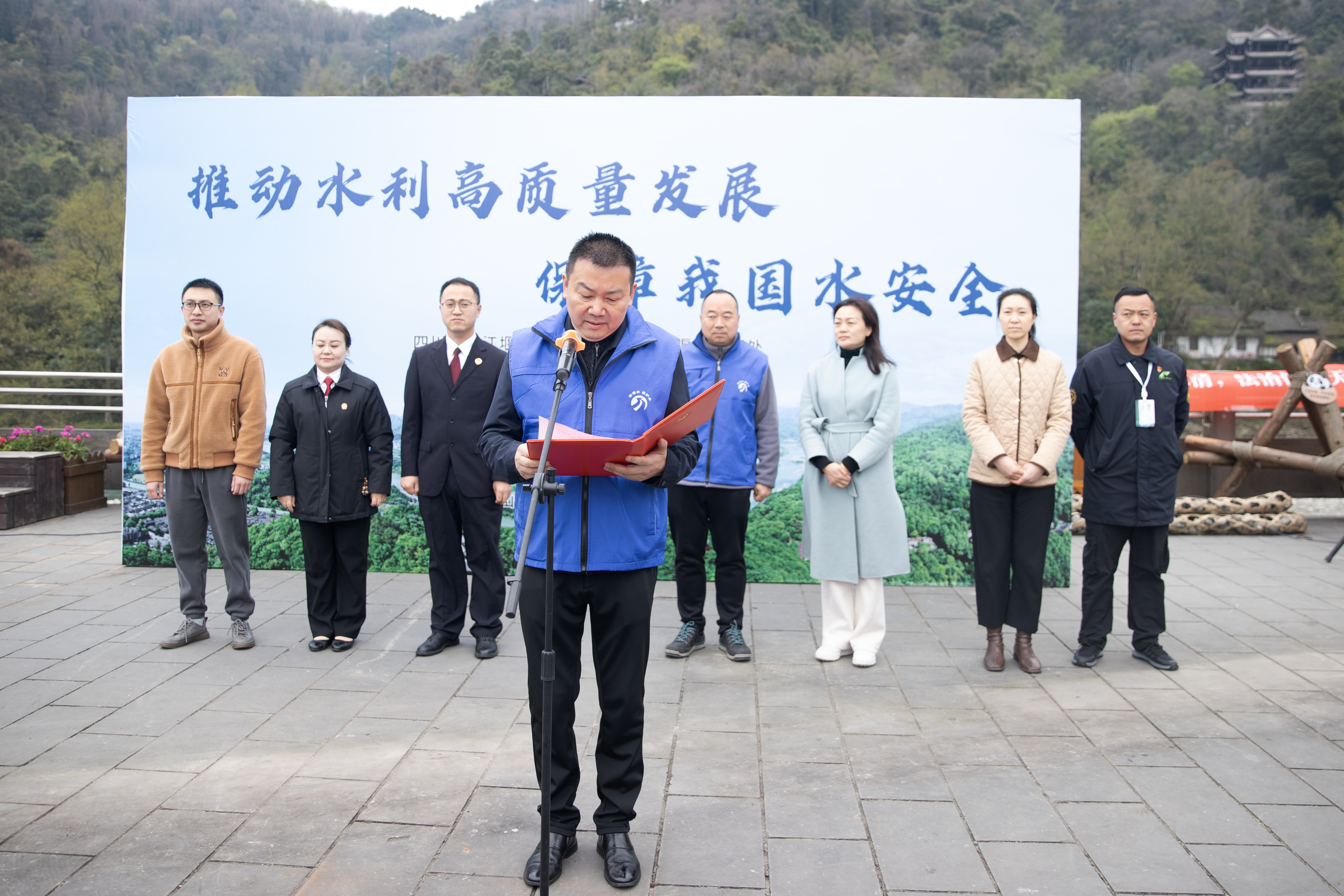 3月22日,都江堰渠首管理处携手都江堰市人民检察院、都江堰市河长办、都江堰市水务局、成都市都江堰生态环境局、都江堰市法院、都江堰市气象局以及青城山——都江堰风景名胜管理局,在都江堰鱼嘴举办宣传活动。都发中心副主任吴鉴在致辞中指出,水资源保护需多方协作、全民参与,呼吁社会各界以“世界水日”为起点,共同提升水环境治理能力,筑牢水安全保障防线。活动现场,水利专家通过生动讲解与互动问答,向游客和市民普及都江堰三大工程的科学原理及当代价值,让千年治水智慧“活”在当下。与此同时,渠首管理处与各单位工作人员沿鱼嘴至飞沙堰展开巡河行动,并向沿途群众发放宣传资料,以实践行动传递“保护水资源、共建美丽灌区”的理念。