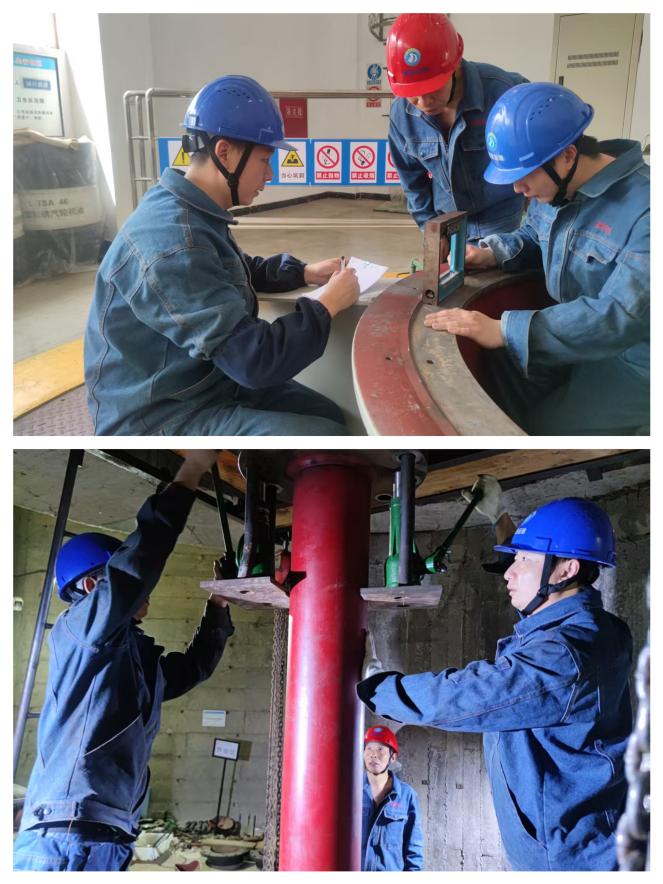 “注意水平仪本身误差,要能调头测量,数据不能超过0.02mm/m的要求,否则会影响机组盘车数据。”在合江电站上机架安装过程中,技师张宪洪正手把手指导新人如何使用框型水平仪。这支由14名技术骨干与3名行业专家组成的检维铁军,在实战中构建起“专家智库技术中坚青年梯队”三级人才培养体系,将检修现场转化为“沉浸式实训课堂”。岗前完成6场专项培训,实现工艺标准、风险预控、质量参数100%全员掌握。攻坚现场开展“三比三看”劳动竞赛(比工艺精度、看检修质量;比攻坚速度、看项目进度;比安全天数、看作风表现)激发创新活力,团队在解决转轮室气蚀修补焊接后与混凝土之间形成的空鼓现象、镜板变形造成盘车数据紊乱等关键环节组成技术攻坚组,解决疑难问题8项。