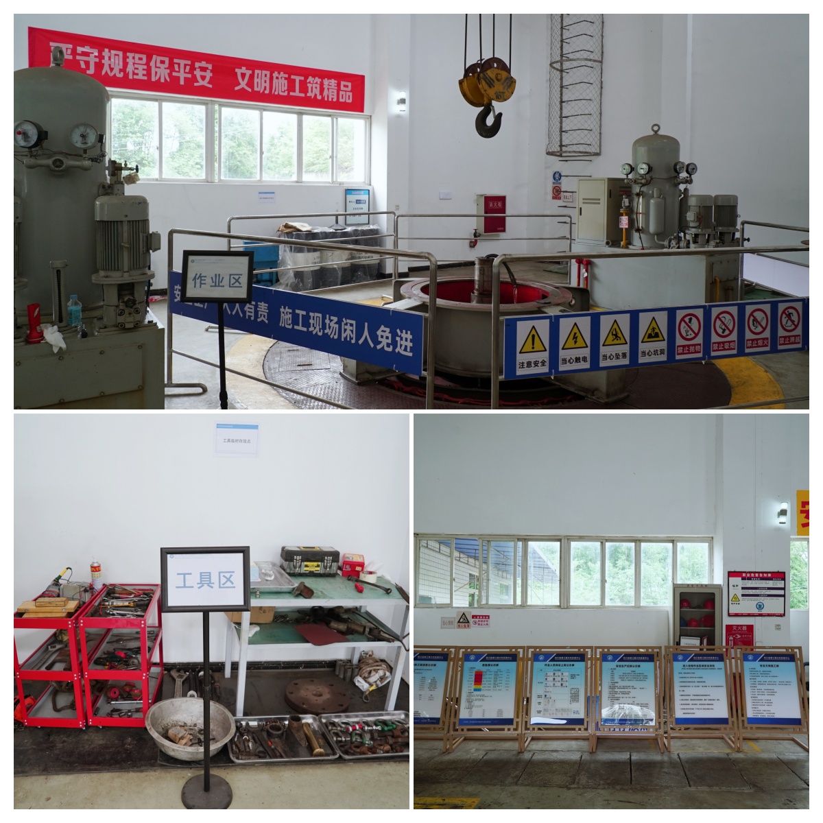 检维队将水利行业标准化工地建设理念引入水电站检修阵地,融入检修实战。走进任意一处检修现场,“七牌三区三线”的标准化布局令人耳目一新。危险源告知牌、工艺流程图、作业人员持证上岗牌等七类标识清晰指引作业路径;检修作业区、工器具区、设备临时放置区三区功能分明;安全警戒线、设备隔离线、人行通道线三线泾渭分明。在智慧管控方面,“五个一”安全机制(一风险一警示、一隐患一档案、一作业一监护、一违章一追溯、一日结一复盘)筑牢安全防线,团队在45天高强度作业中保持安全零事故,为同类型检修树立了安全管控标杆。
