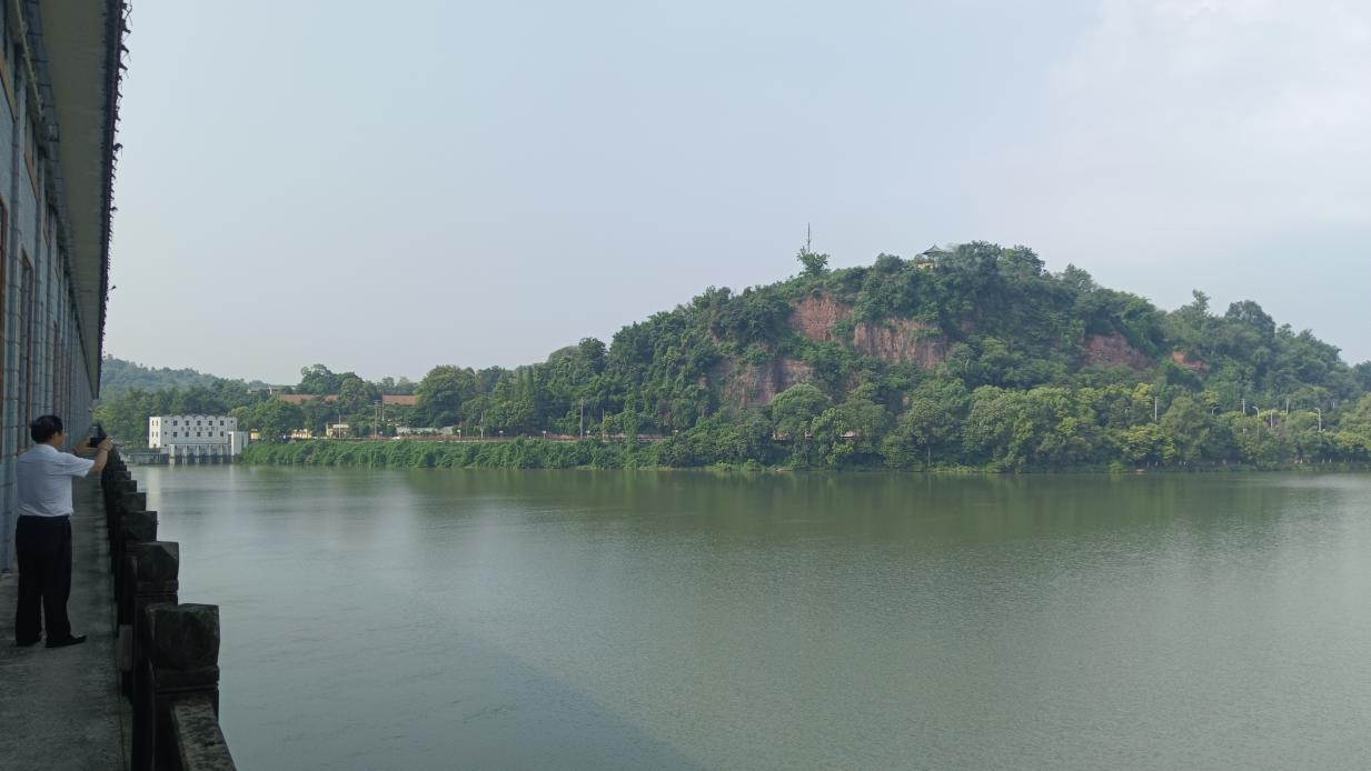 而不远处的千年古堰——通济堰,恰处于这山、城、江河之间,作为川西重要的从古沿用至今的著名水利工程,始建于西汉景帝后元三年(公元前141年),至今仍发挥着积极的灌溉、供水、防洪等综合效益,灌溉新彭眉平坝52万亩农田。它与修觉山相互依存,构成新津十二景之首的“堰堤春涨”。清嘉庆年间新津县令王梦庚曾作诗描述:“横亘长虹浪作梯,岷江灵脉取如携。笼成岸石千重密,束尽江流万派低。碧草光融春淡荡,桃花涨暖影迷离。西畴灌溉资优渥,可但寻游拟画溪。”每至春日,桃花水发,春水漫过堰堤,气势磅礴,堰堤以上江面却水平如镜,夹岸树绿山青,与修觉山相映成趣,宛如一幅绝美的山水画卷。