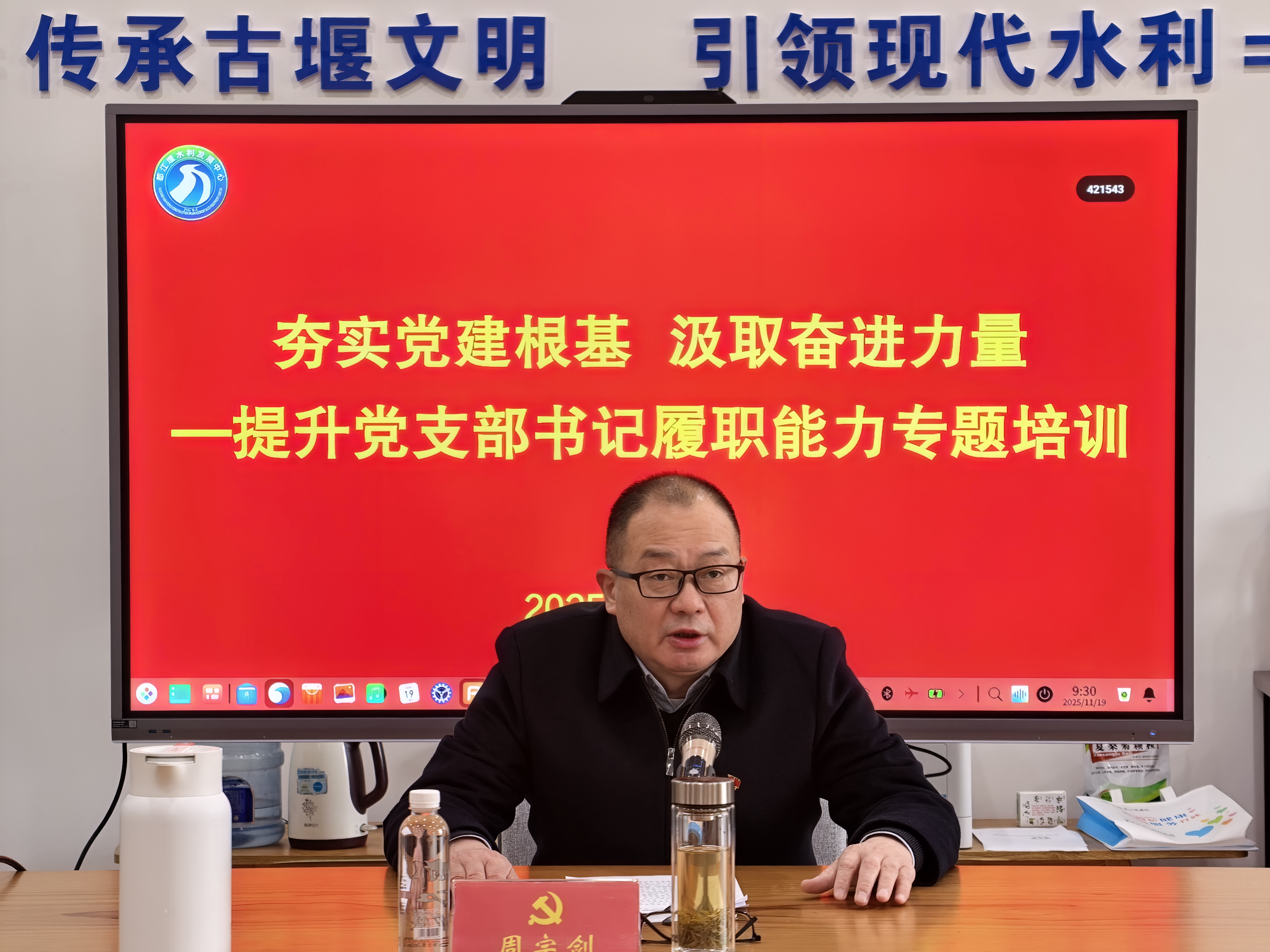 11月19日,人民渠第一管理处开展以“夯实党建根基,汲取奋进力量”为主题的提升党支部书记履职能力专题培训。党委书记、处长周宗剑参加培训并讲话。
