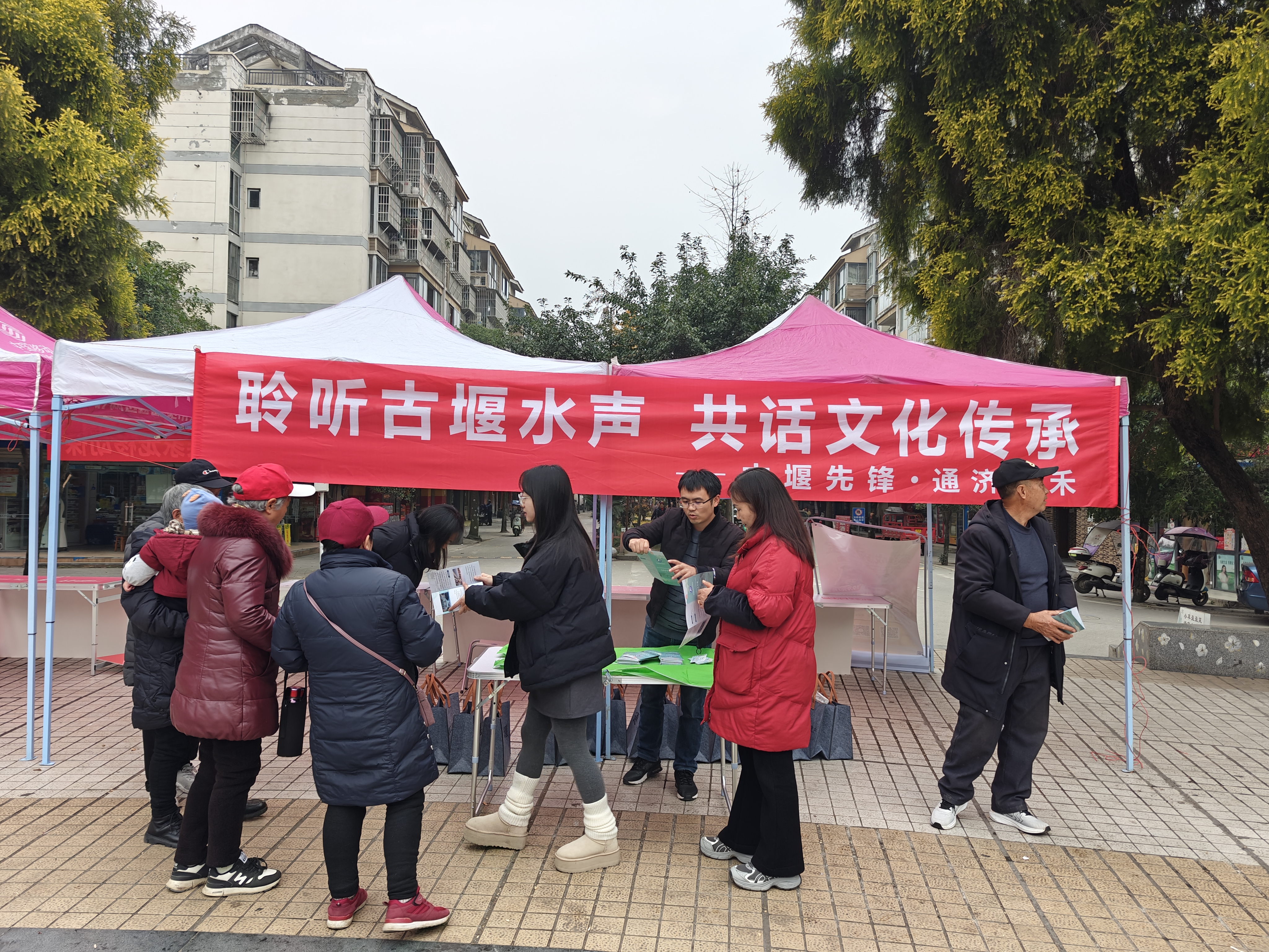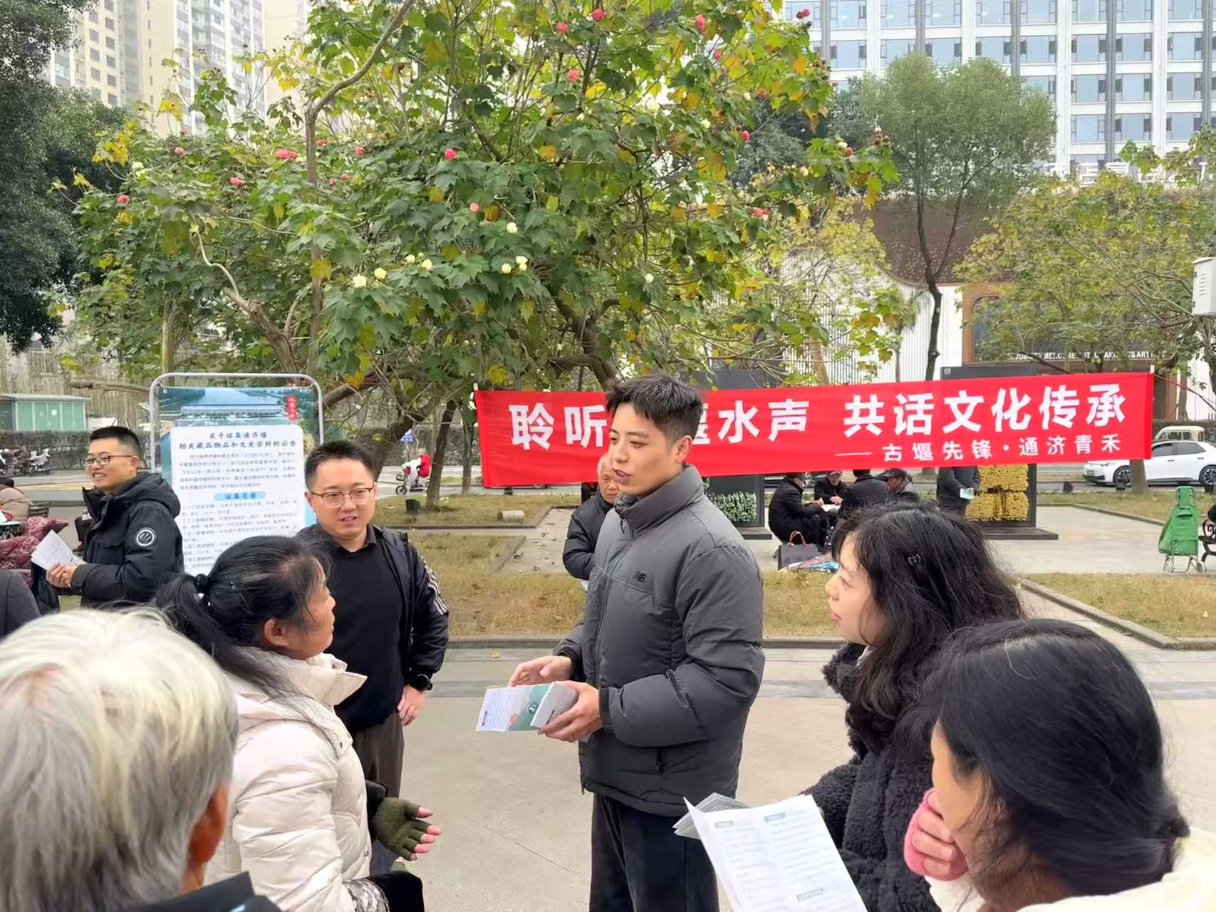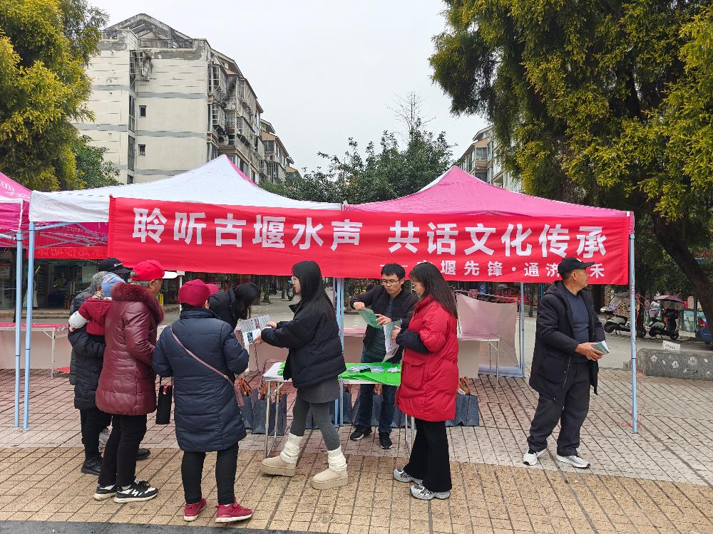 12日,宣传活动走进社区,处机关及各站机关所在社区的宣传点位刚一布置好,便吸引了不少居民驻足。青年宣讲员们围着展板,用接地气的家常话、生动的历史典故,向居民们讲述古堰的前世今生、灌溉效益,以及传承水利文化对推动区域可持续发展的深层意义,让大家读懂了身边这座“活化石”的珍贵价值。互动问答中,宣讲员们抛出的通济堰知识趣味问答,让群众们踊跃举手、争相作答,欢声笑语中普及了水文化知识。活动现场还发放了文物征集手册和定制礼品,广泛发动居民加入文物征集与古堰保护的行列,让水文化宣传的种子在社区落地生根。