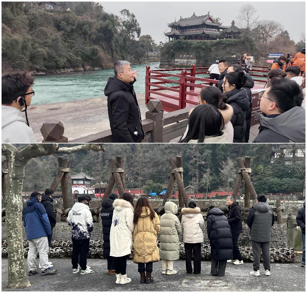 副处长徐兴文以灌区区域图、工程布置示意图为脉络,将灌区历史、现状、改革发展时代答卷娓娓道来。都江堰堰工技术非遗传承人引领大家行走在金刚堤,与鱼嘴、飞沙堰、宝瓶口近距离接触,用“活态解说”生动诠释古人“道法自然”的治水智慧,共同触摸都江堰水利工程的千年脉动。