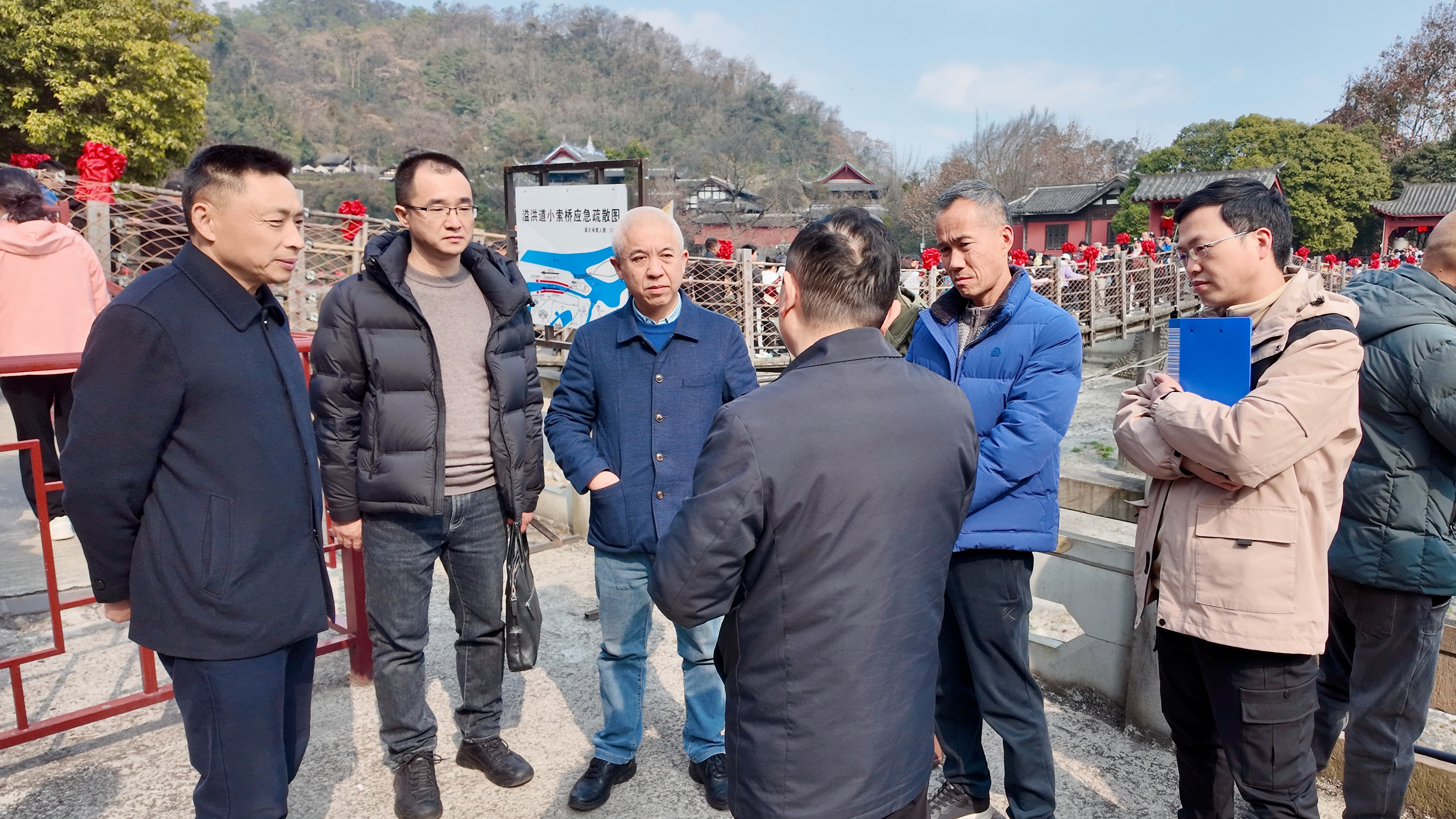 督导组现场查看了小索桥及跨河临时便道、电动观光车停车场、上善若水剧场等关键设施及场所,重点检查了设施的结构稳固性、安全警示标识设置、消防器材配备及维护情况,详细了解防火巡查制度、应急照明系统、应急预案及应急演练情况。