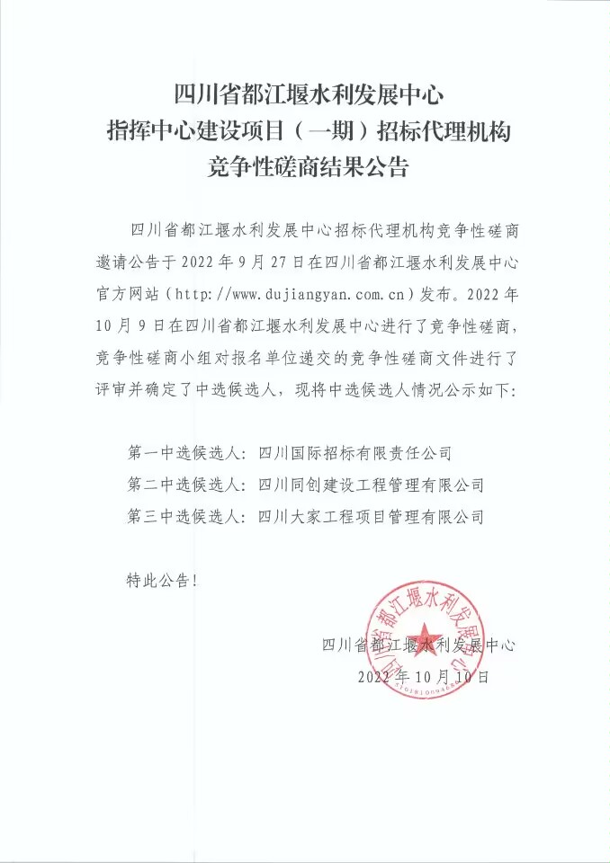 四川省都江堰水利发展中心指挥中心建设项目(一期)招标代理机构竞争性蹉商结果公告