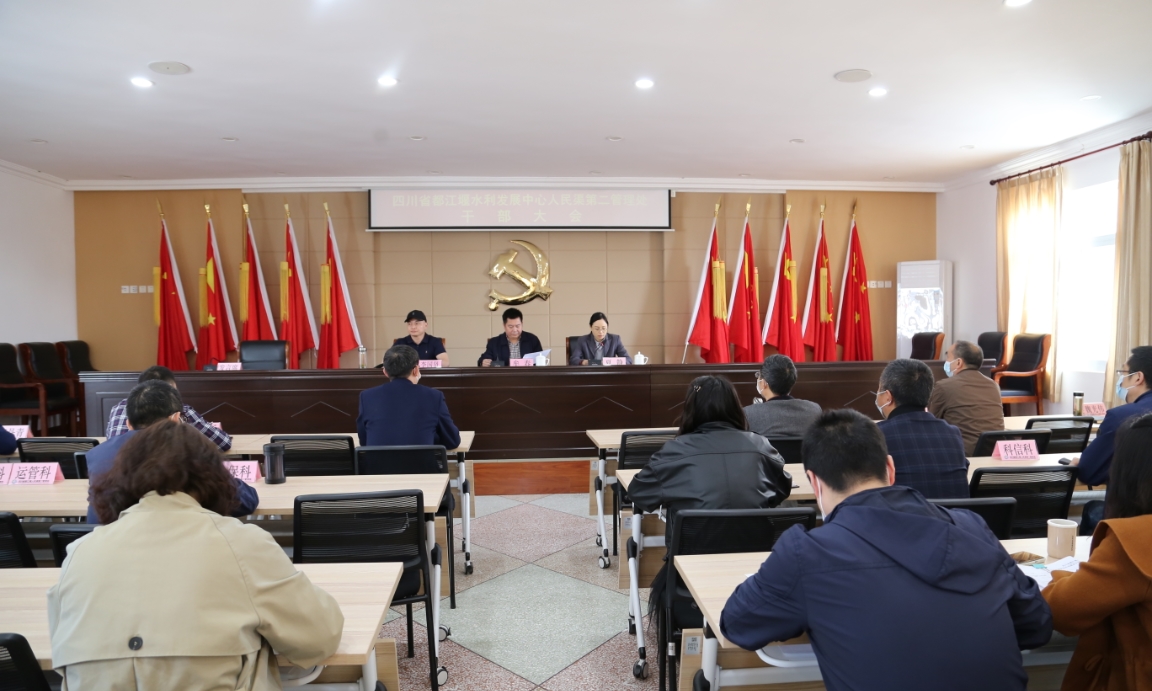 2022年4月20日,四川省都江堰水利发展中心人民渠第二管理处召开干部大会。水利厅人事处处长牟春、副处长夏静,人民渠二处在家处领导、中层干部参加了会议,会议由夏静主持并宣读了厅党组关于方丹青同志的任职决定。