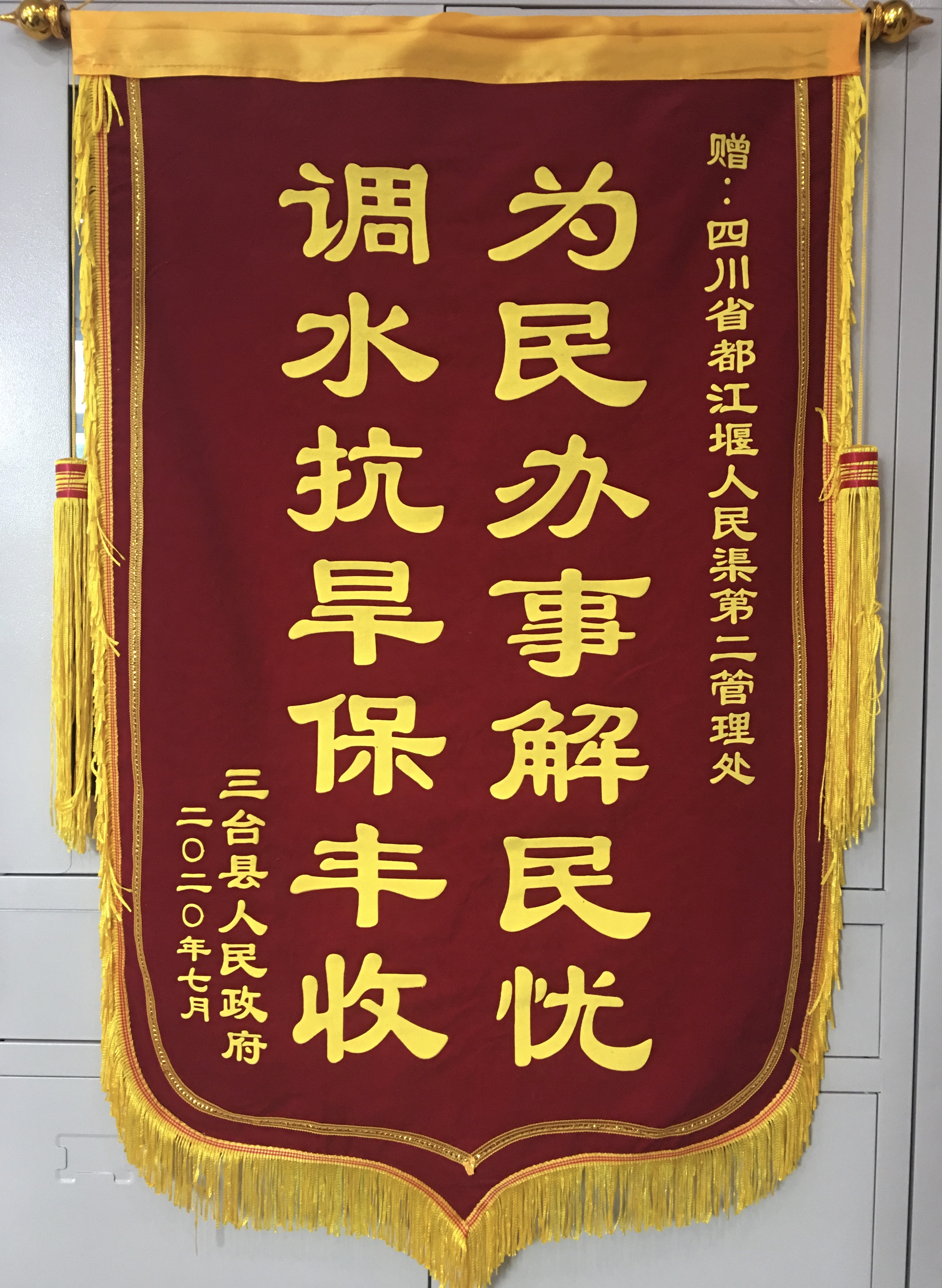 人民渠二处杨刚总工程师代表人民渠二处接收锦旗,杨刚表示,虽然三台县处于人民渠六期、七期尾水灌区,但是在春灌抗旱期间,人民渠二处本着“一个都不能少”的原则,树立全灌区一盘棋的意识,统筹上下游,兼顾左右岸,及时上报旱情、积极争取水源,采取多种措施,协调各方做到了全灌区和谐用水、均衡受益,取得了春灌抗旱工作的阶段性胜利。三台县人民遭受了严重的旱灾,在如此艰难情况下依然遵守调水指令、维护用水秩序,人民渠二处向一直理解、支持调水工作的灌区人民表示感谢。人民渠二处要将三台县人民浓浓情谊传递到每一位职工,鼓舞全体职工继续服务好灌区,全心全意做好接下来的掺灌、蓄水工作,以优质的服务回报灌区人民对人民渠二处的信赖。