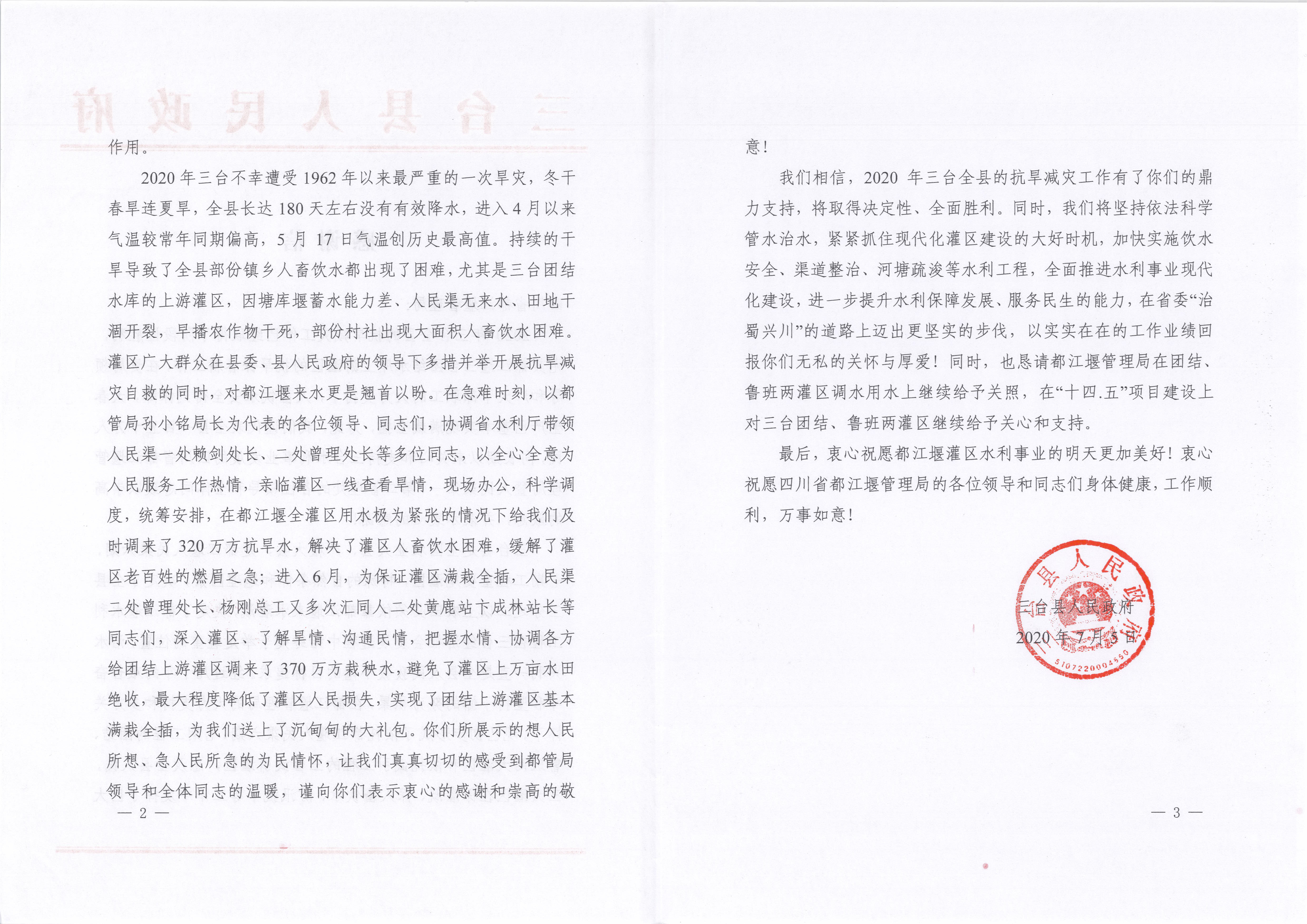 下午,三台县水利局一行在杨刚和供水科工作人员的陪同下到人民渠一处、都江堰管理局分别送上锦旗和感谢信,饮水思源,由衷的表达对都江堰灌区统筹兼顾、鼎力相助的感谢之情。
