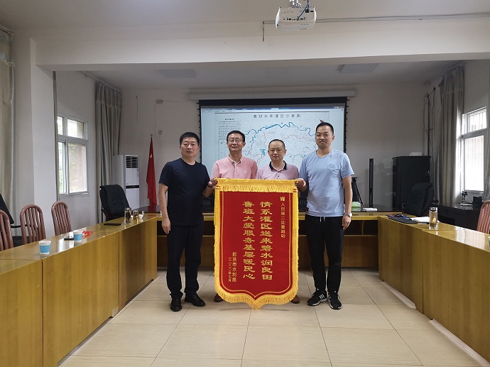 7月31日,射洪市水利局局长王彬、射洪市人民渠工程建设管护中心主任赵建国一行为鲁班站送来一面锦旗,感谢鲁班站在今年抗旱保苗战中做出的重要贡献。随后,鲁班站与射洪市灌区就今年的春灌抗旱工作与下一步工作进行座谈交流,人民渠二处总工程师杨刚、供水科副科长王开锋到会指导。