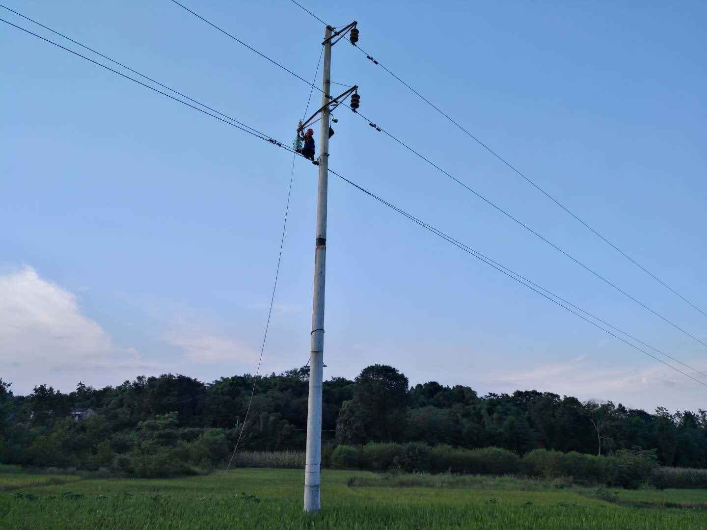 红旗电站银河车间上网输电35KV中银线从1990年建成投入运行至今30余年,电站按照电力规程对该线路杆塔进行维护,线路运行正常。今年8月以来,35kV中银线,几次遭受强暴雨与雷电天气,线路频繁出现跳闸故障,严重影响线路无法安全运行,电站经过组织技术人员对整条线路进行了巡视、排查,并登杆对杆塔绝缘子进行了监测和线路绝缘电阻的测试,研判为线路老化、部分绝缘子有裂伤等多方面因素导致绝缘电阻不能满足安全运行需要,决定利用当前停水有利时机,全线更换绝缘子和登杆安全隐患排查。