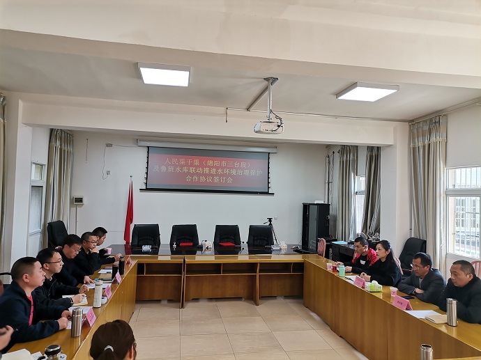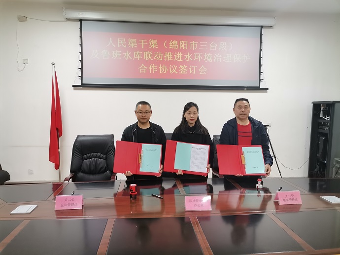 为贯彻落实中央和省市全面推行河长制决策部署,加强四川省都江堰人民渠第二管理处与三台县工作,充分落实《四川省河长制办公室关于在都江堰灌区开展河长与灌区管理单位互访活动的通知》要求,营造流域协同发展的良好氛围,2020年11月18日人民渠二处鲁班管理站、金山管理站与三台县河湖保护中心共同签订在鲁班水库管理中心《联动推进人民渠干渠(绵阳市三台段)水环境治理保护合作协议》。