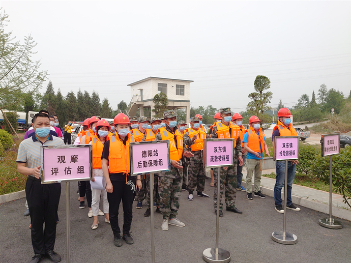演练前,德阳管理站防汛领导小组对应急演练流程和目的作简要说明,要求快速、有效的处置在德阳管理站管辖范围干渠发生的洪水及重大灾害事故。双东镇宋新书记作了简短的动员,朱是副处长宣布防汛演练正式开始,拉开了此次演练的序幕。演练模拟从星火工段区域正下大暴雨,渠道水位已超过防汛限制水位、雷击造成星火电站甩负荷、双东境内人民渠五七渠干渠48+730处出现了高边坡危岩垮塌及外坡滑坡险情,及时处理事故现场和疏散转移受威胁范围内村民四个方面开展。