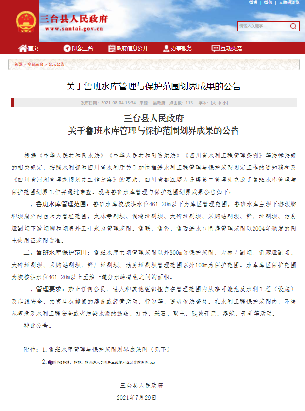 2021年8月4日,三台县人民政府在县政府网发布了《鲁班水库管理与保护范围划界成果的公告》,标志着鲁班水库管理与保护范围划界工作公示程序的完成。