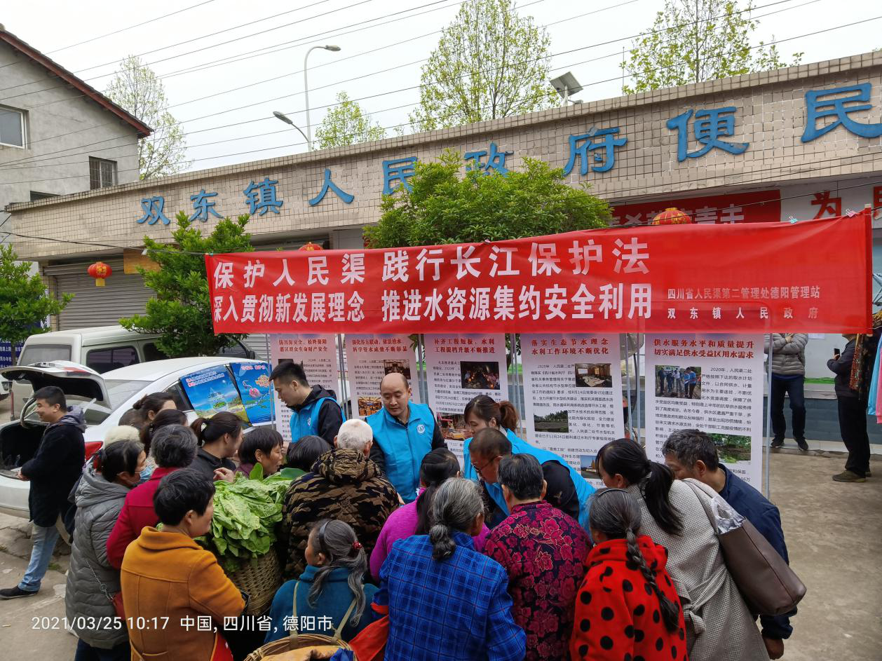 3月1日,《中华人民共和国长江保护法》正式施行,3月22日是第二十九届“世界水日”,3月22日-28日是第三十四届“中国水周”。为深入贯彻新发展理念,推进长江大保护和水资源节约利用,提高全民保护长江、节约水资源的意识,德阳站联合双东镇人民政府围绕“保护人民渠,践行长江保护法”“深入贯彻新发展理念,推进水资源集约安全利用”主题,在双东镇及街道开展了宣传活动。