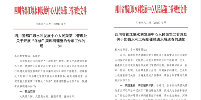 周密部署,打好水利保护主动战。主要负责同志亲自抓、负总责,压实各环节工作责任,发布《都发中心人民渠第二管理处关于开展“冬修”渠库清理整治专项工作的通知》《都发中心人民渠第二管理处关于加强水利工程毗邻联通水域巡查的通知》,打好水利保护“组合拳”。