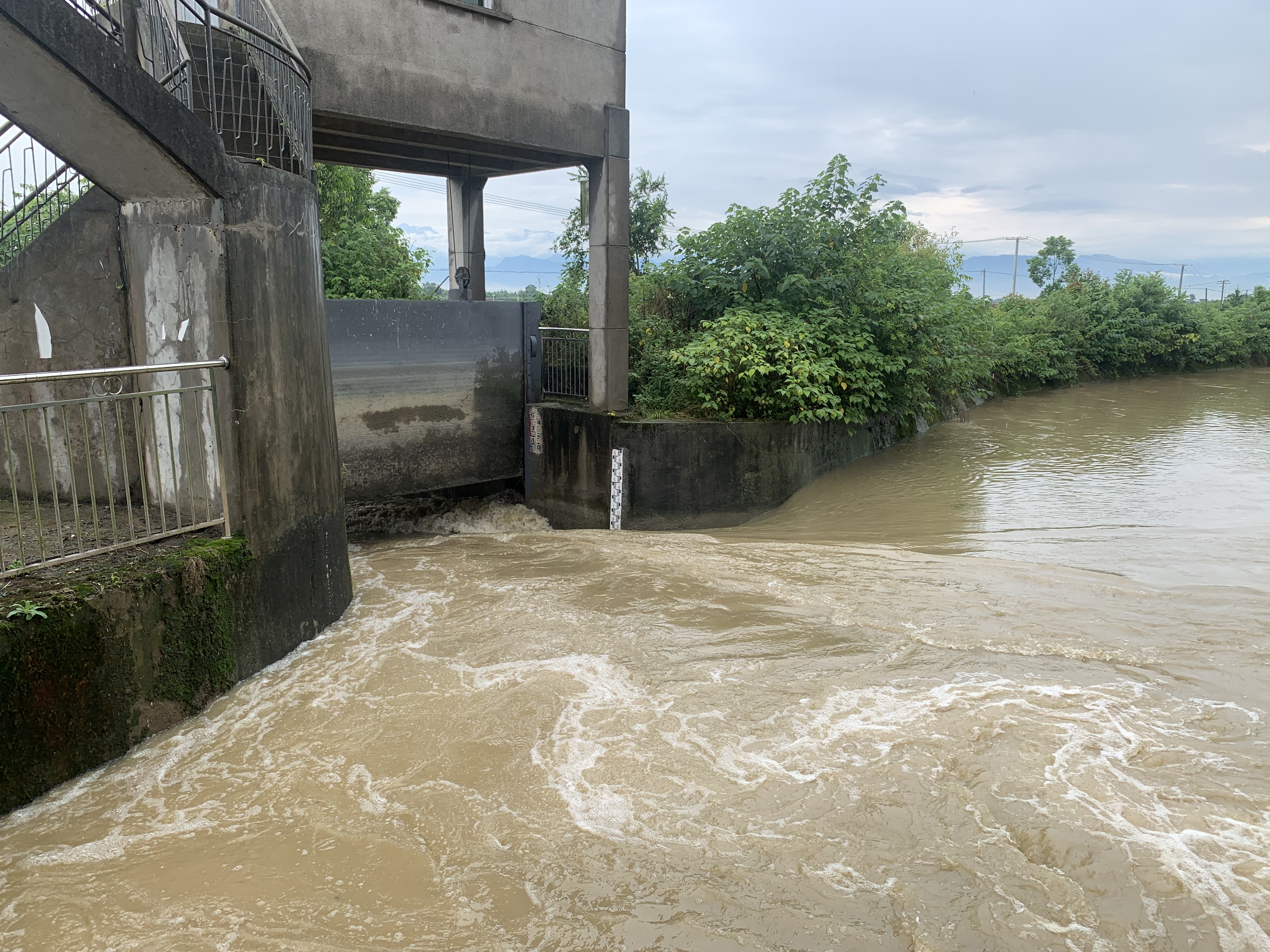 7月12日,罗江水利管理站干渠沿线普降暴雨。本轮降雨来势凶猛,时间长,雨量大,部分地区日最大降雨量达到326mm。秀水河水位迅速上涨,人民渠六期干渠沿渠区间径流形成洪水大量入渠,罗江水利管理站迎来了今年第一次洪水的挑战。
