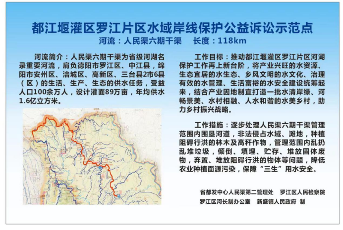 随着《四川省河湖长制条例》出台以及四川省人民检察院与四川省水利厅共建都江堰灌区水利保护公益诉讼示范区工作的深入推进。人民渠第二管理处乘势而上、主动作为,以“管好盆中的水必须先管好装水的盆”为目标,将水域岸线治理作为水利保护头号工作,先后与属地河长制办公室建立河湖保护“三项制度”,联合属地检察院、河长办建立都江堰灌区罗江片区河湖保护公益诉讼示范区,在罗江区新盛镇水域岸线种植密集区域内长期“整不动”、治理后又高复发且群众较为密集的地带,建立首个灌区水域岸线保护公益诉讼示范点,以小切口推动人民渠六期干渠水利保护大治理。