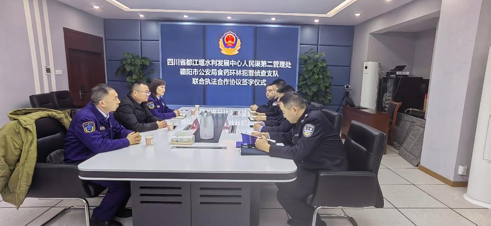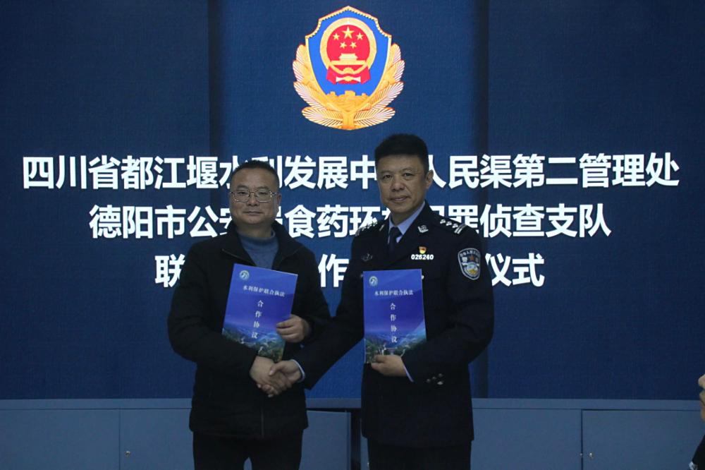 为深入贯彻习近平生态文明思想,进一步强化都江堰灌区水利保护执法力量,筑牢灌区水生态屏障。12月18日,人民渠第二管理处与德阳市公安局食药环林犯罪侦查支队签署《联合执法合作协议》(以下简称“协议”)。人民渠第二管理处党委委员、副处长林洪光、德阳市公安局食药环林犯罪侦查支队政委傅强出席签约仪式。