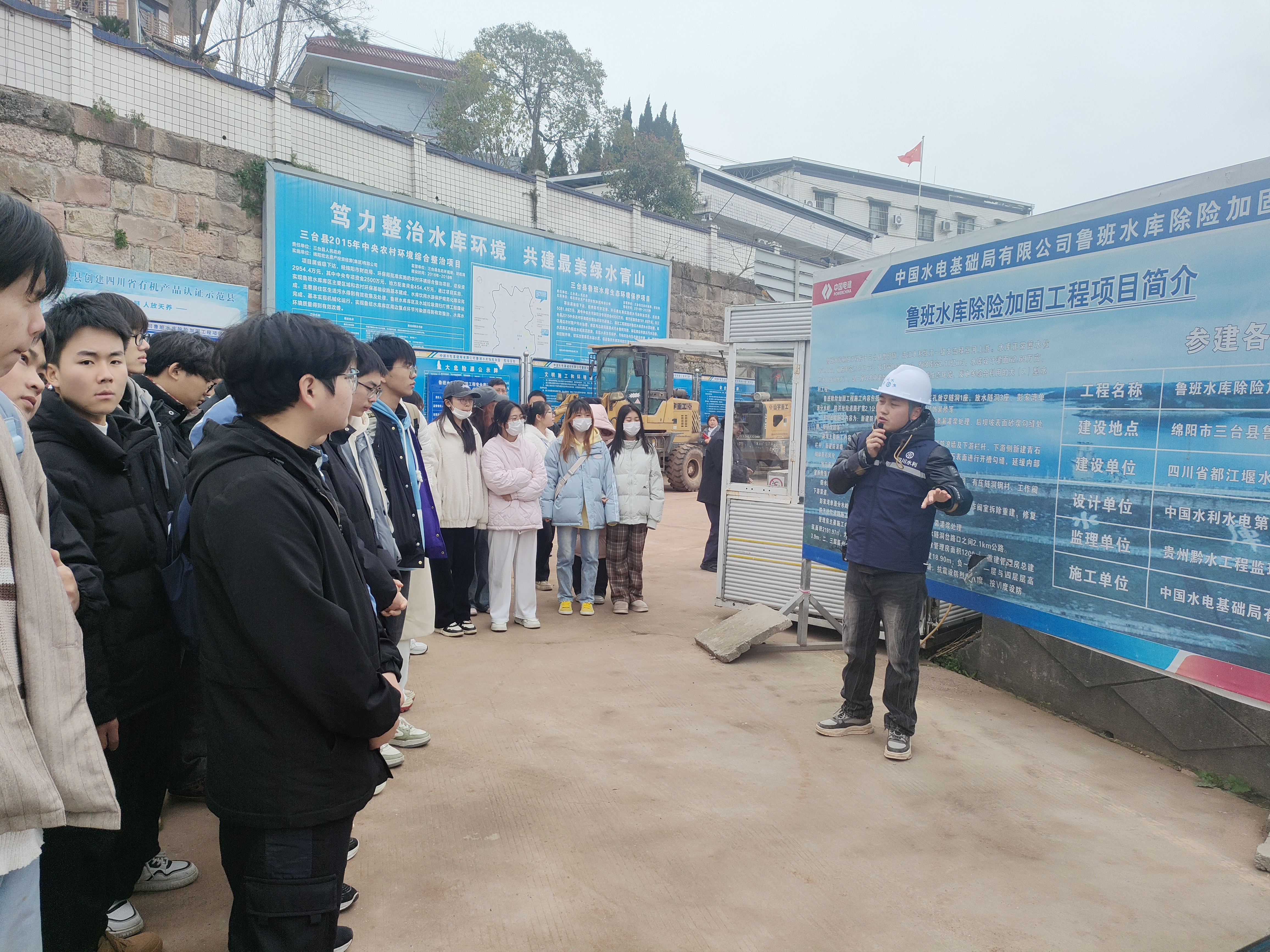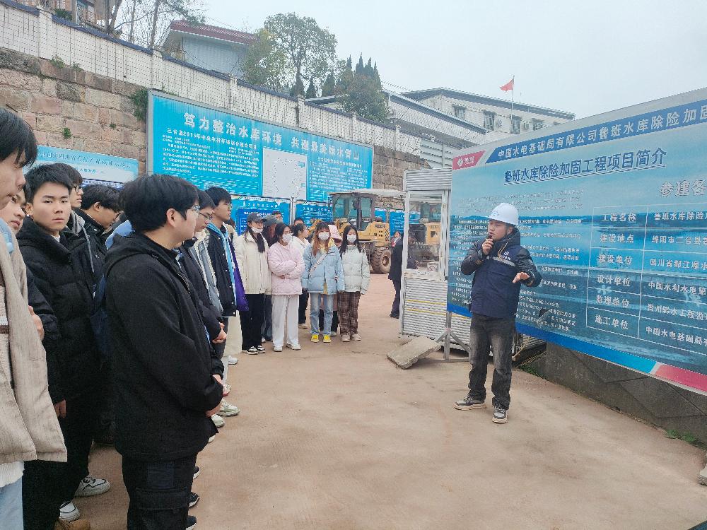 在鲁班水利管理站,工作人员热情接待师生一行,并向同学们详细介绍鲁班水库的相关情况。始建于上世纪70年代的鲁班水库拥有2.94亿立方米的库容,其水面面积广阔,是一座以灌溉为主,兼有供水、发电等综合利用功能的大型水利工程,在水资源存储和调节方面发挥着重要作用。其不仅在当地的水利体系中发挥着中流砥柱的作用,更是一座承载着先辈们智慧与汗水的历史丰碑。在建设工地旁,工作人员着重介绍了此次鲁班水库除险加固工程工作,同学们认真聆听并积极提问,现场学习氛围浓厚。