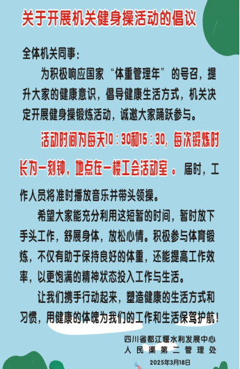 为深入践行“健康中国”理念,积极响应国家“体重管理年”号召,切实增强职工队伍凝聚力,营造“快乐工作、健康生活”的团队氛围,人民渠第二管理处组织处机关干部职工开展健身操锻炼活动,全面展现新时代水利人团结奋进、锐意进取的精神风貌。